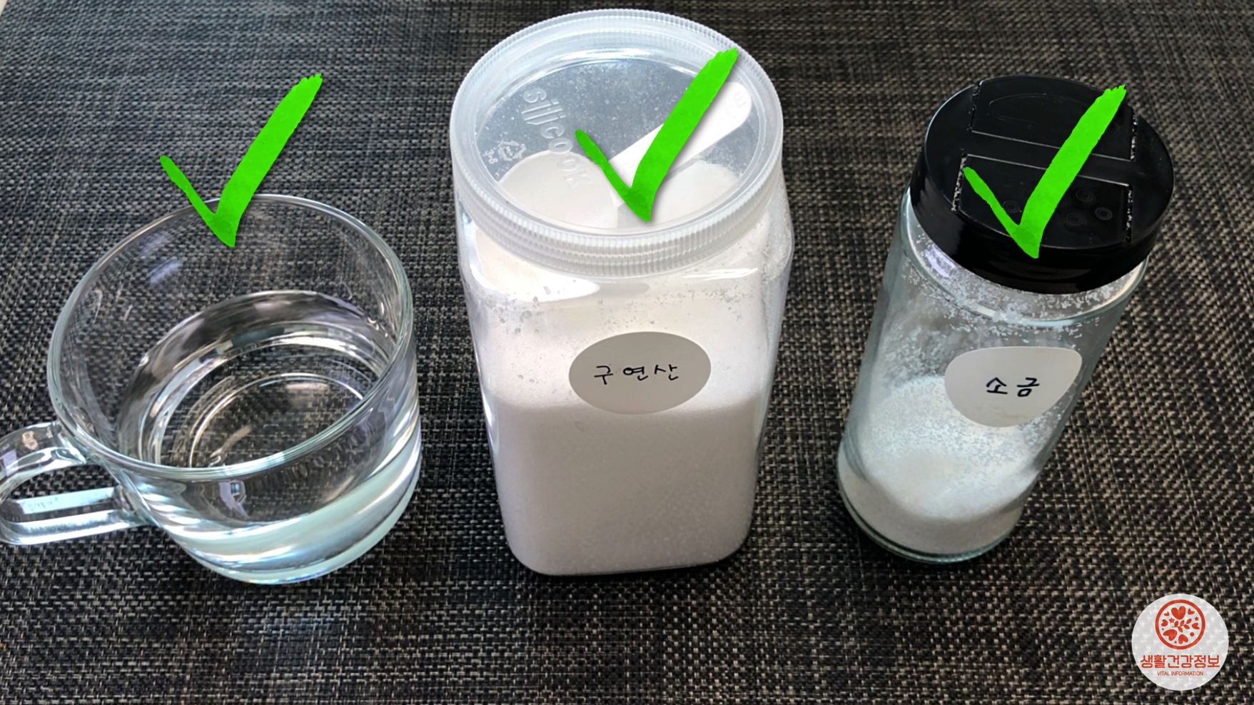 준비물은 물, 구연산, 소금 이렇게 3가지에요.