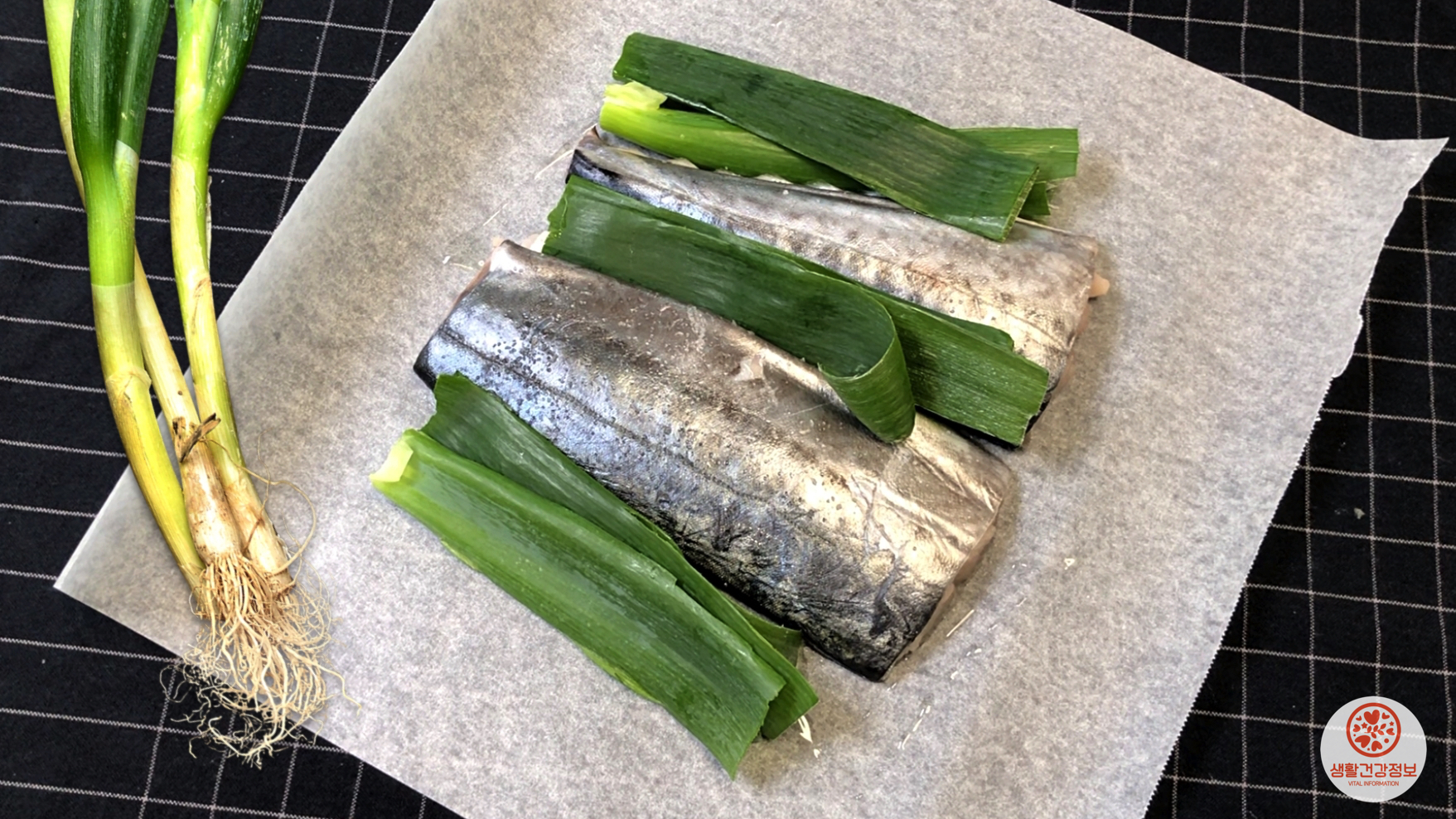 길쭉하게 손질한 대파를 생선 양옆으로 올려주세요.