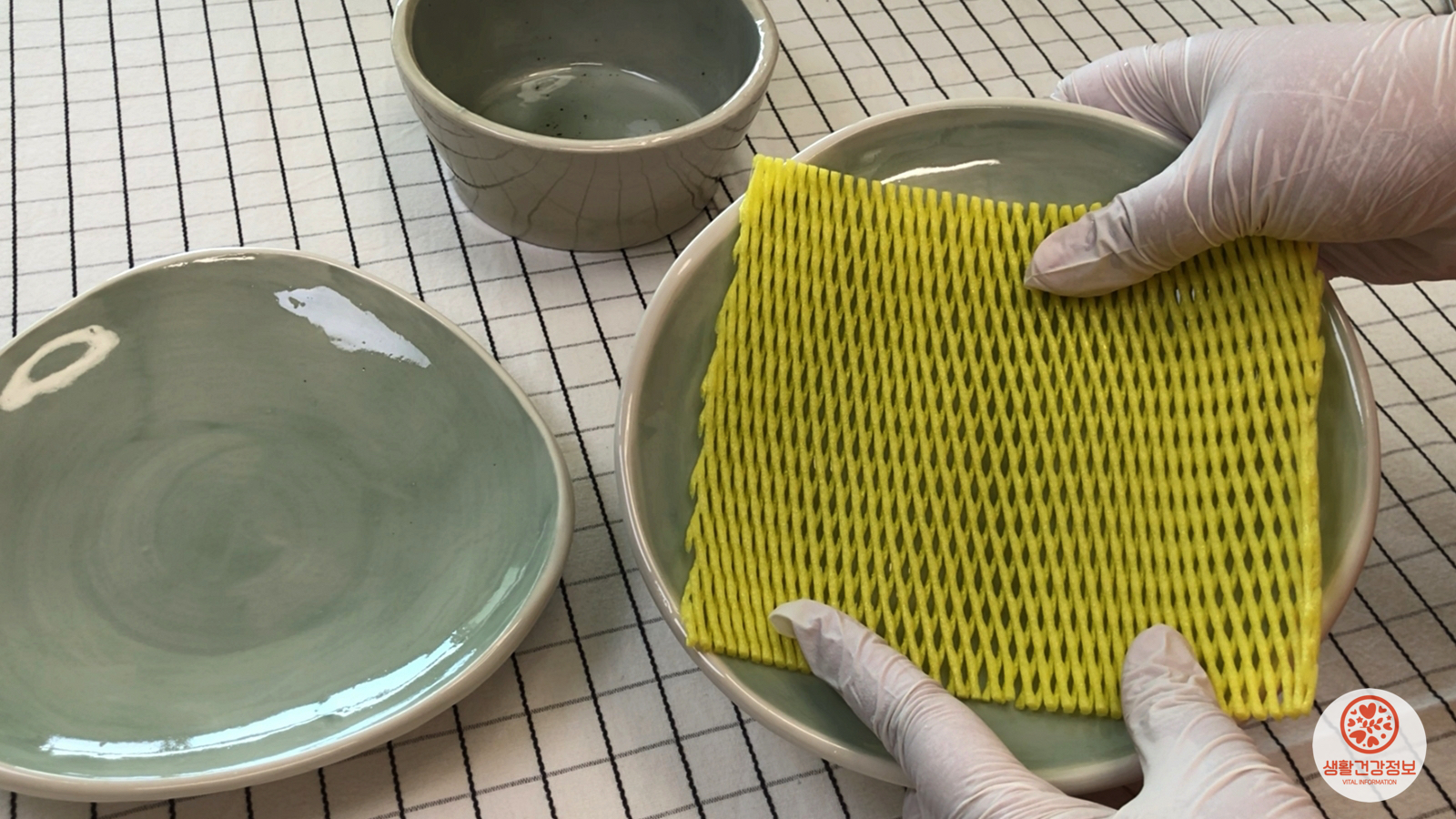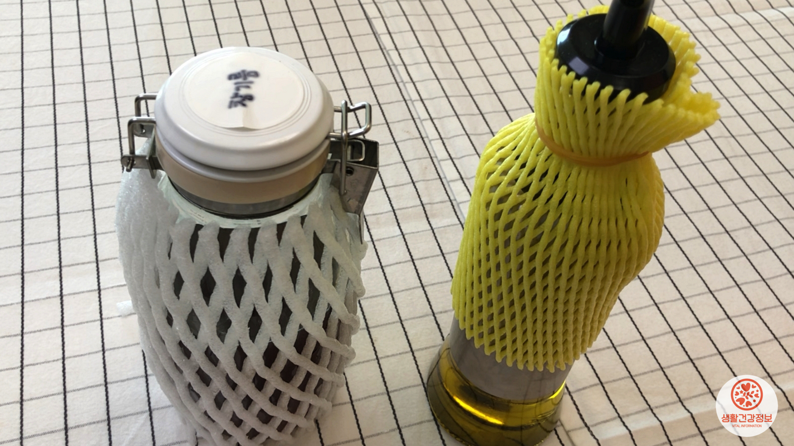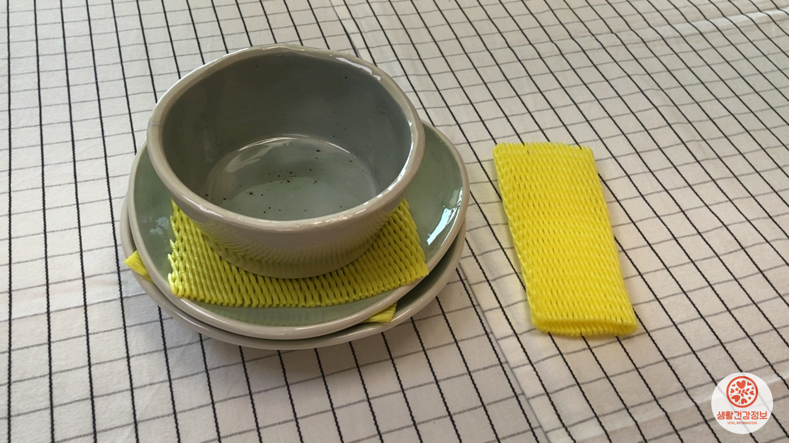 과일포장망을 잘라서 그릇 사이에 끼우면