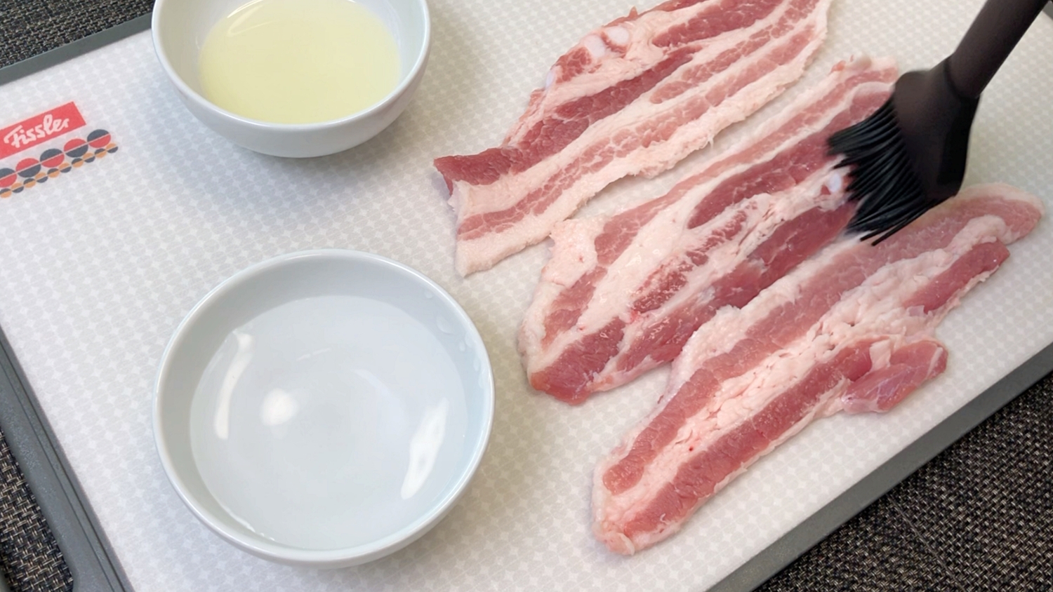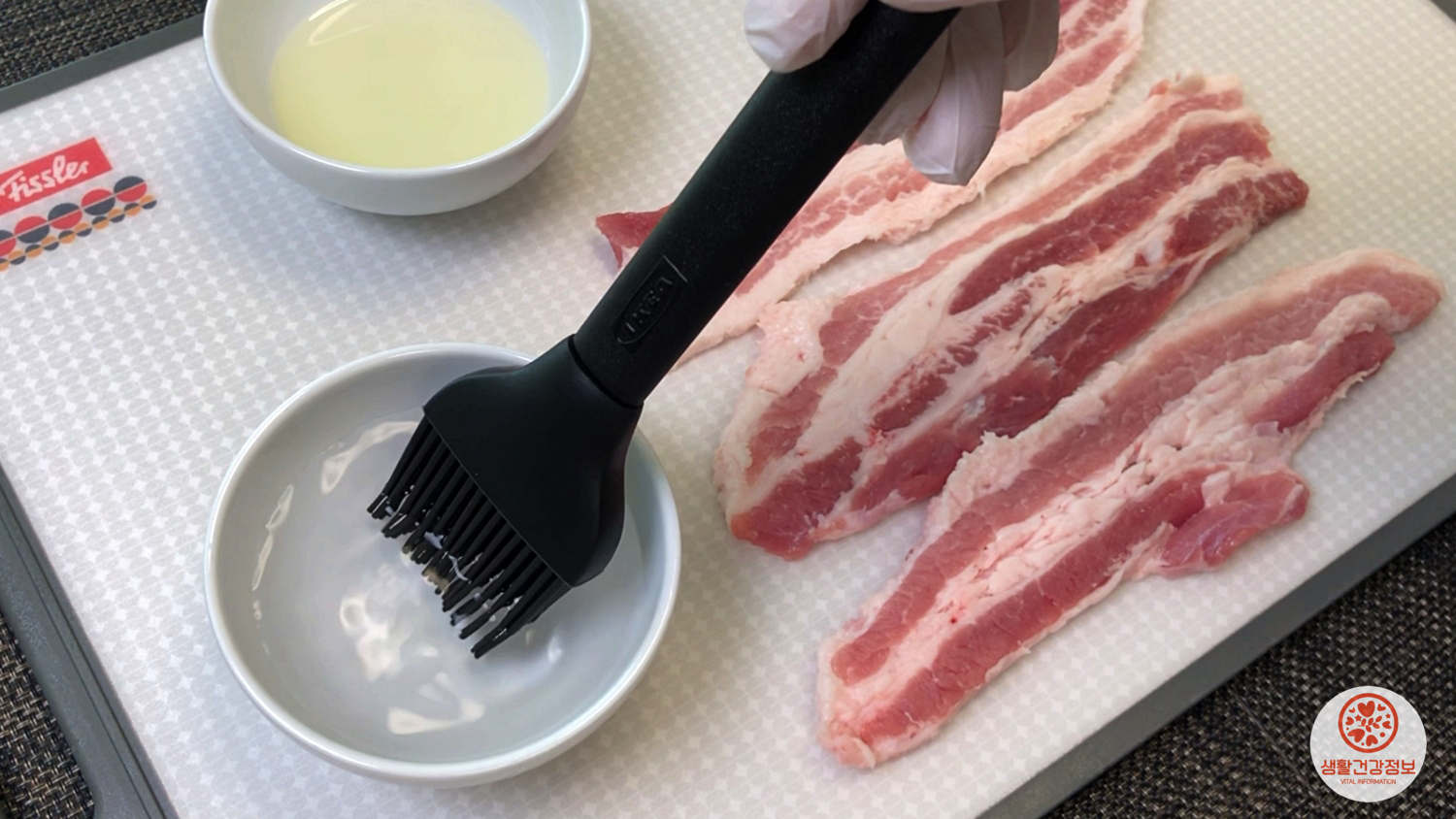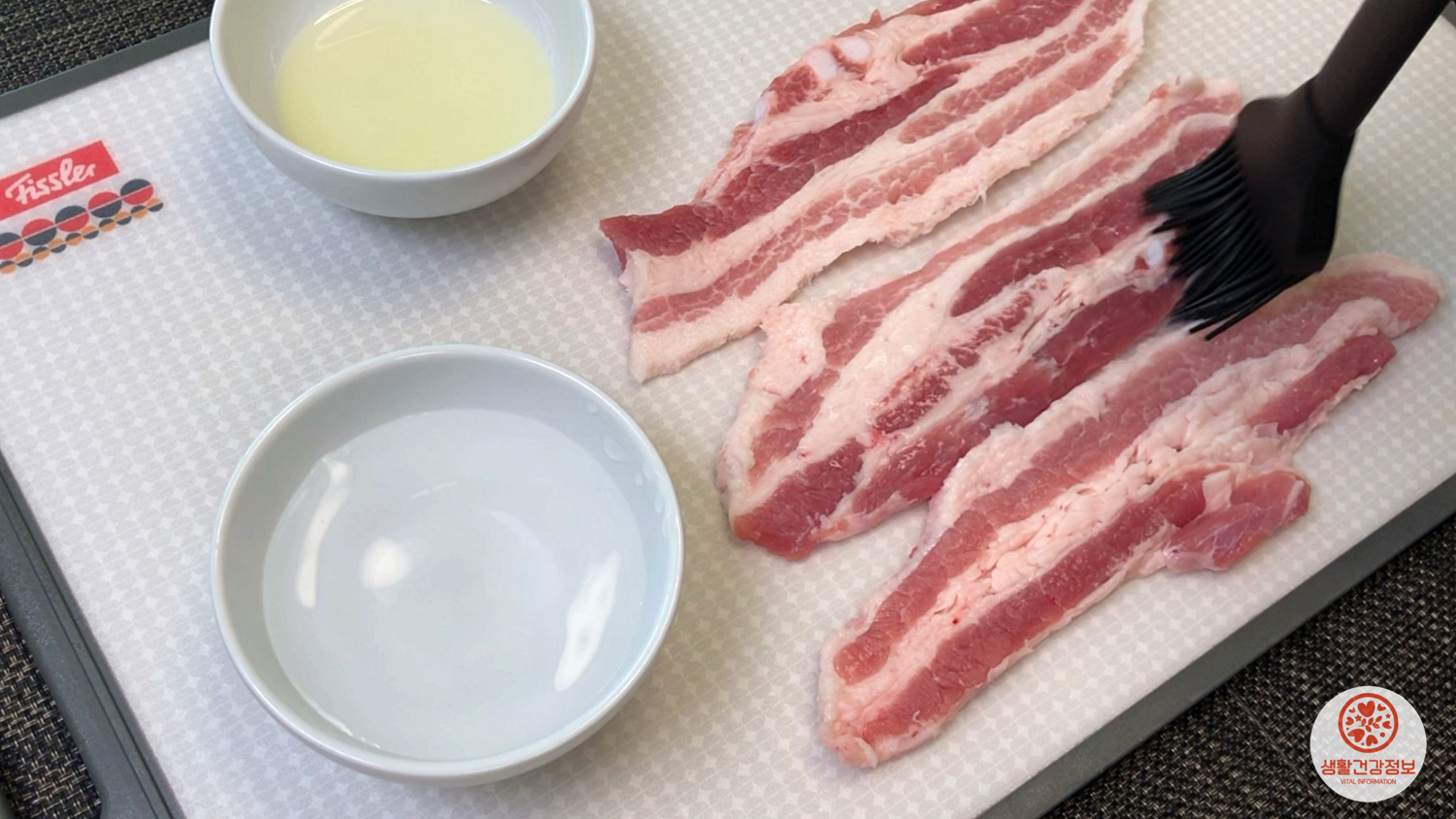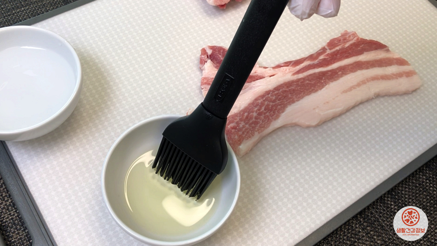 돼지고기의 앞뒤로 얇게 식용유를 바르면
