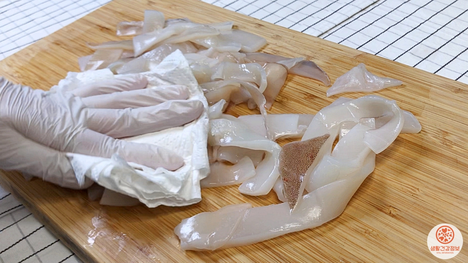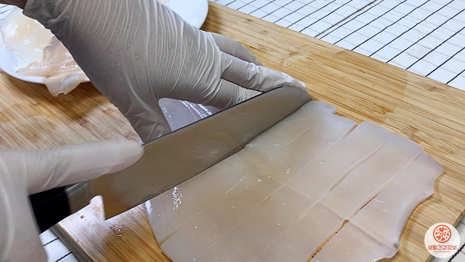세척한 오징어를 일정한 두께로 썰고,