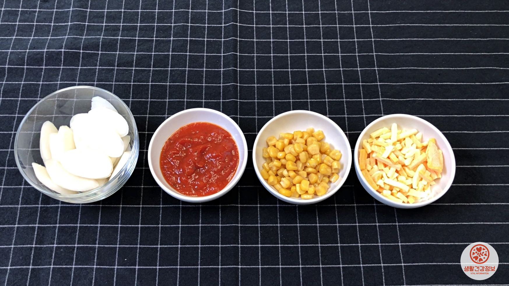 떡국떡, 토마토소스, 옥수수콘, 모짜렐라치즈