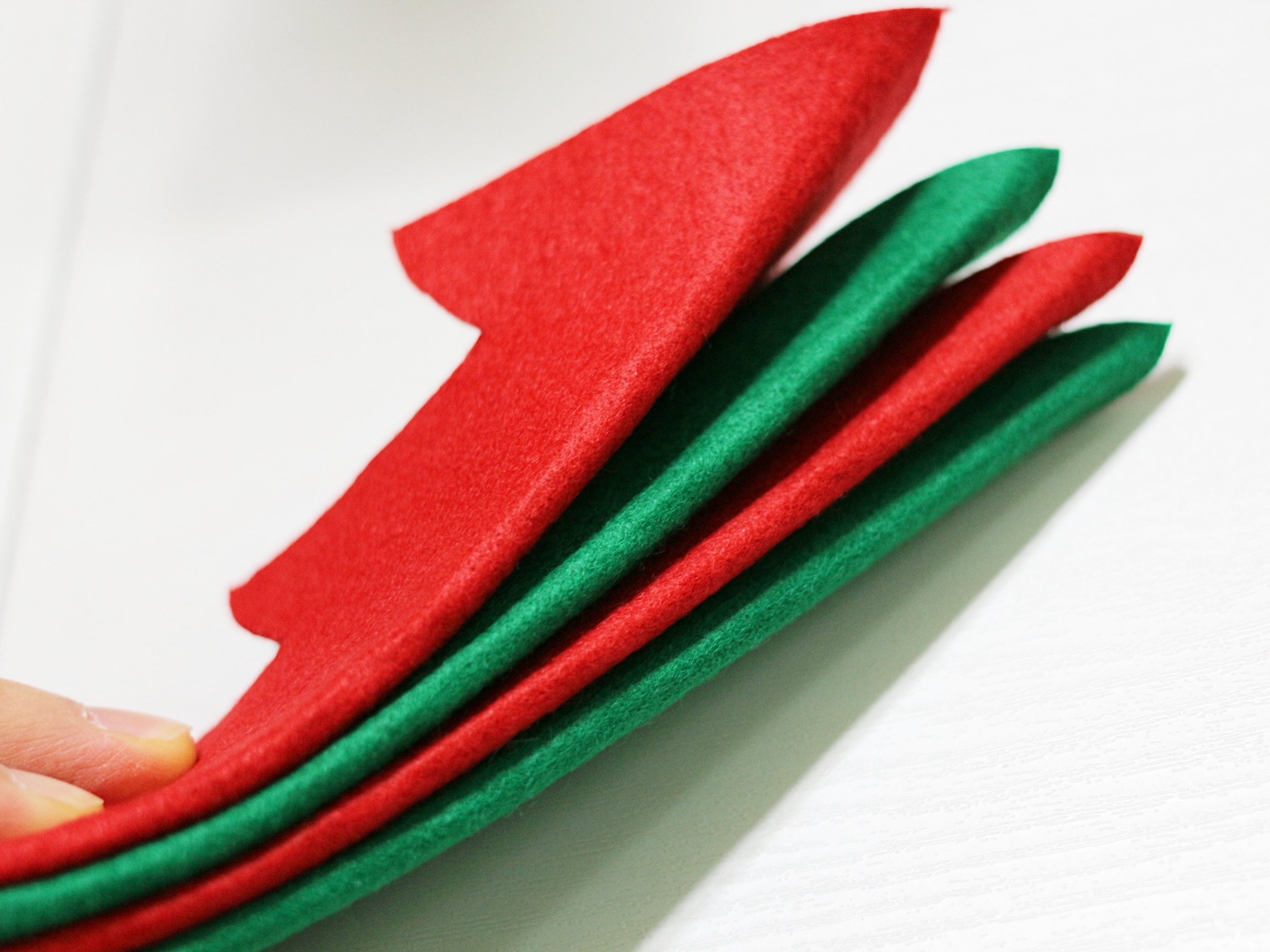 펠트지에 트리 모양 도안을 대고 밑그림을 그려요.
