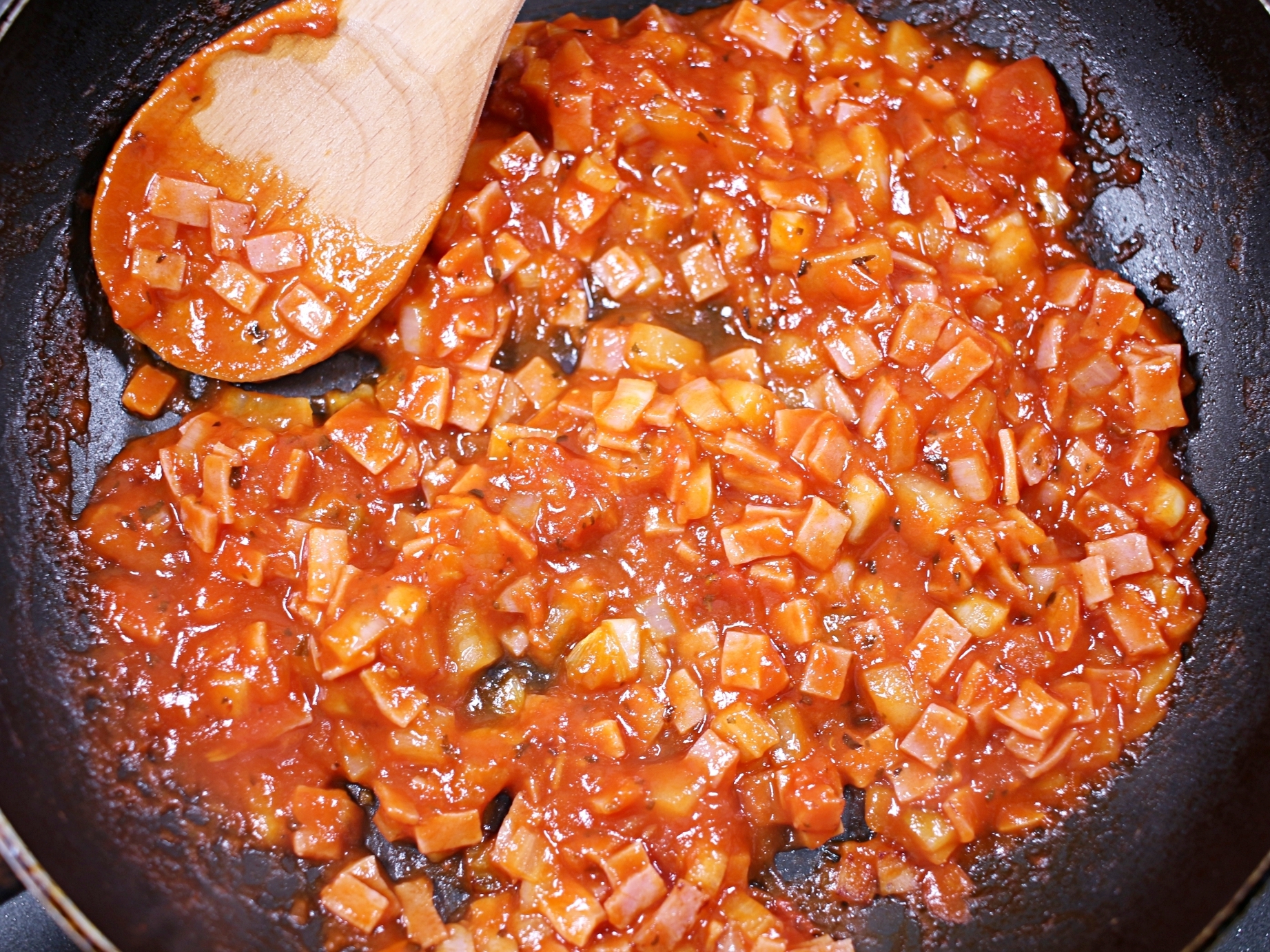 고소한 냄새가 퍼질 때쯤 토마토소스를 넣고