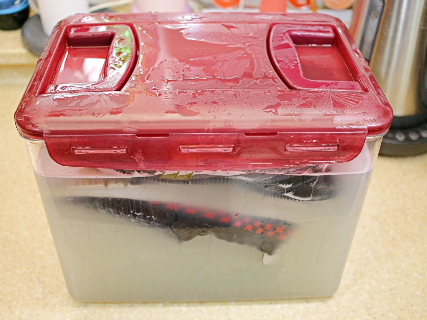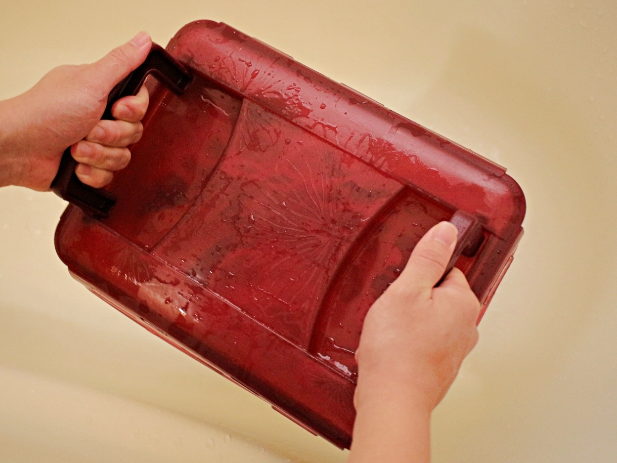 세척한 김치통에 따뜻한 물을 반쯤 채우고