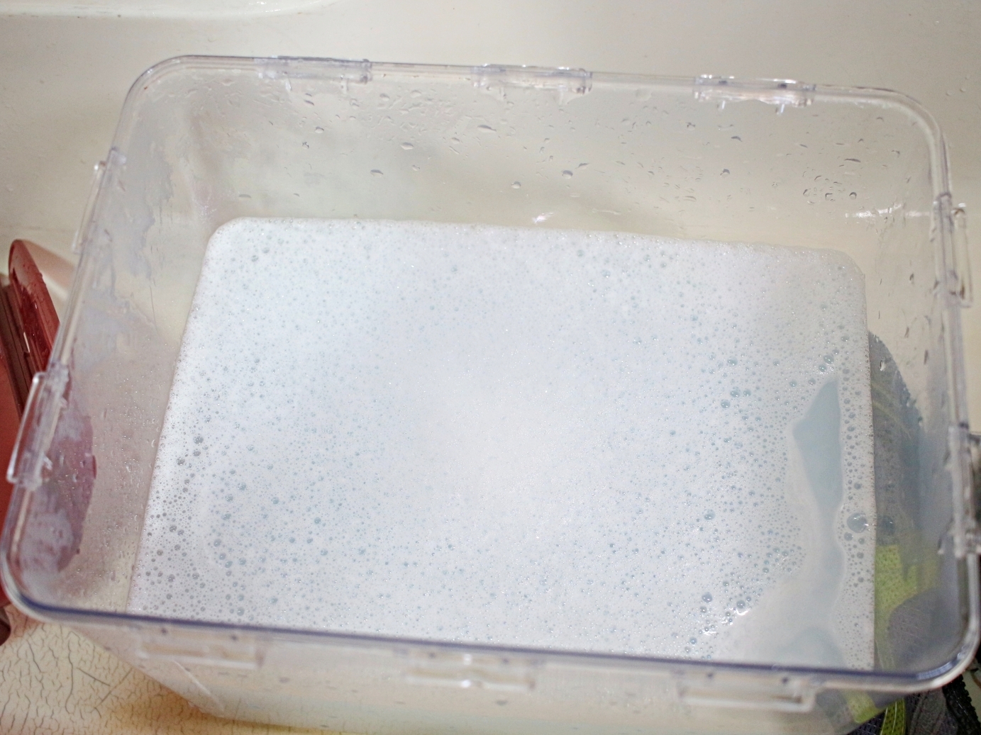 세제물 채운 김치통에 퐁당~ 담가주세요.