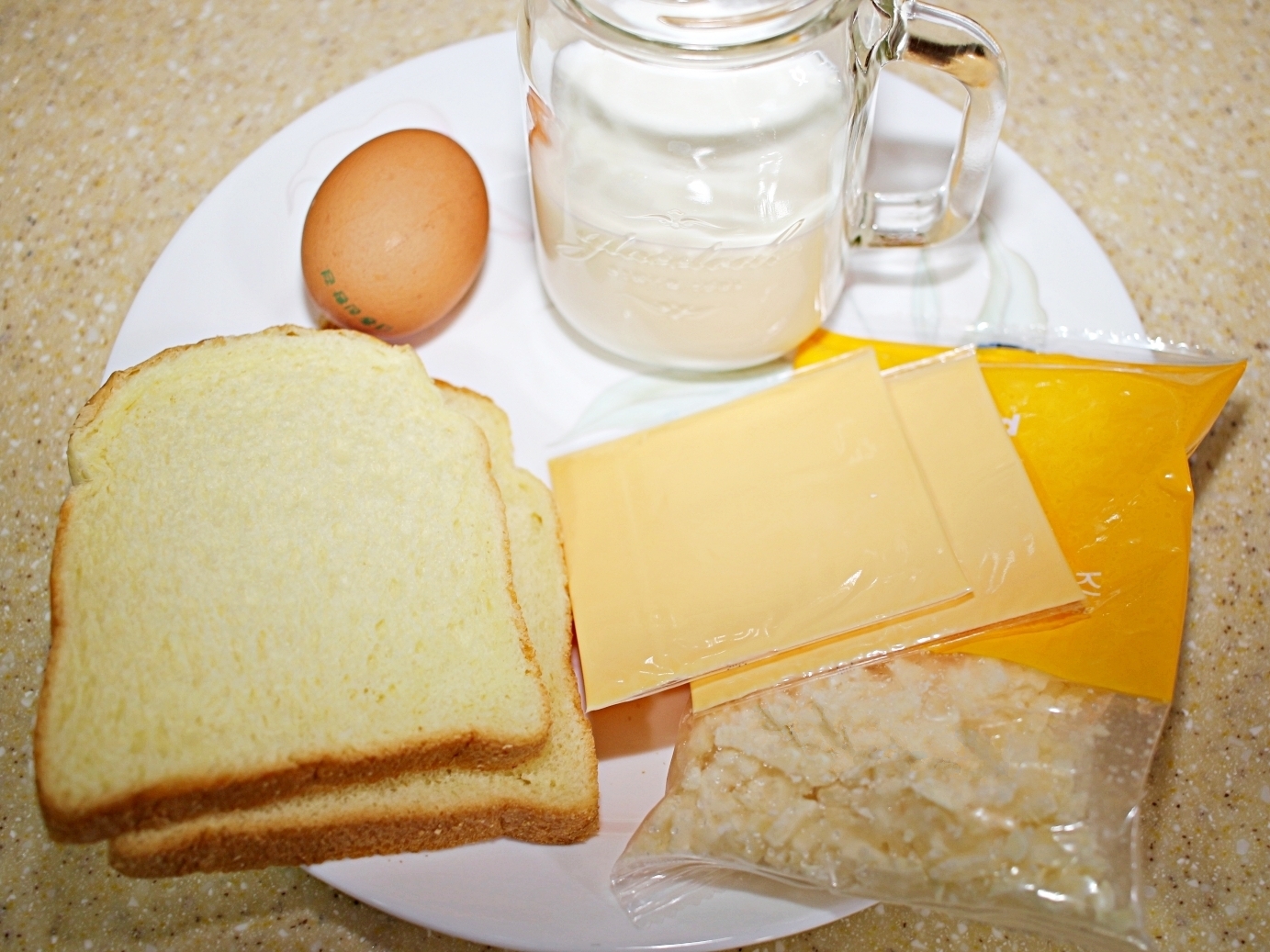 재료는 식빵, 계란, 치즈, 우유 끝.
