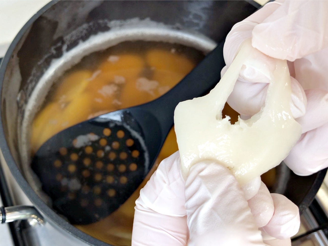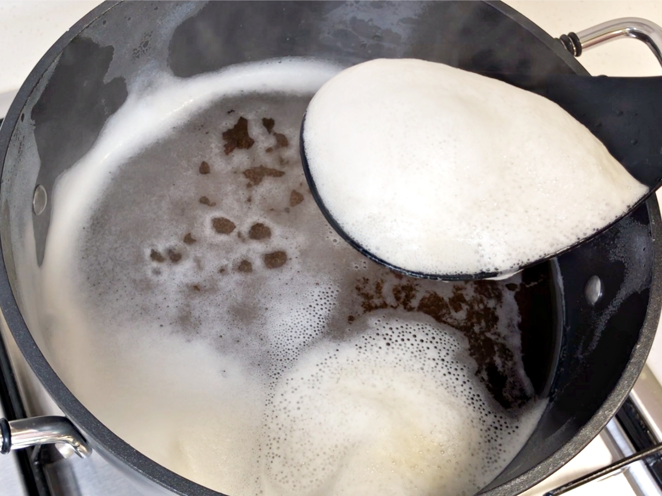 한가득 끓어오른 거품을 걷어내 주시고요.