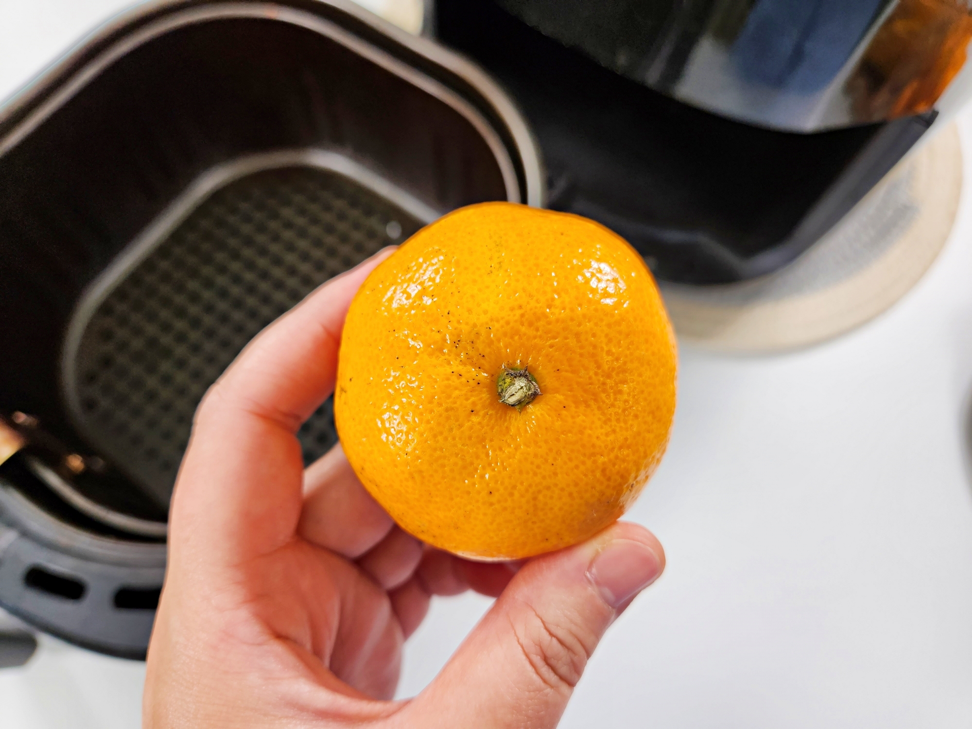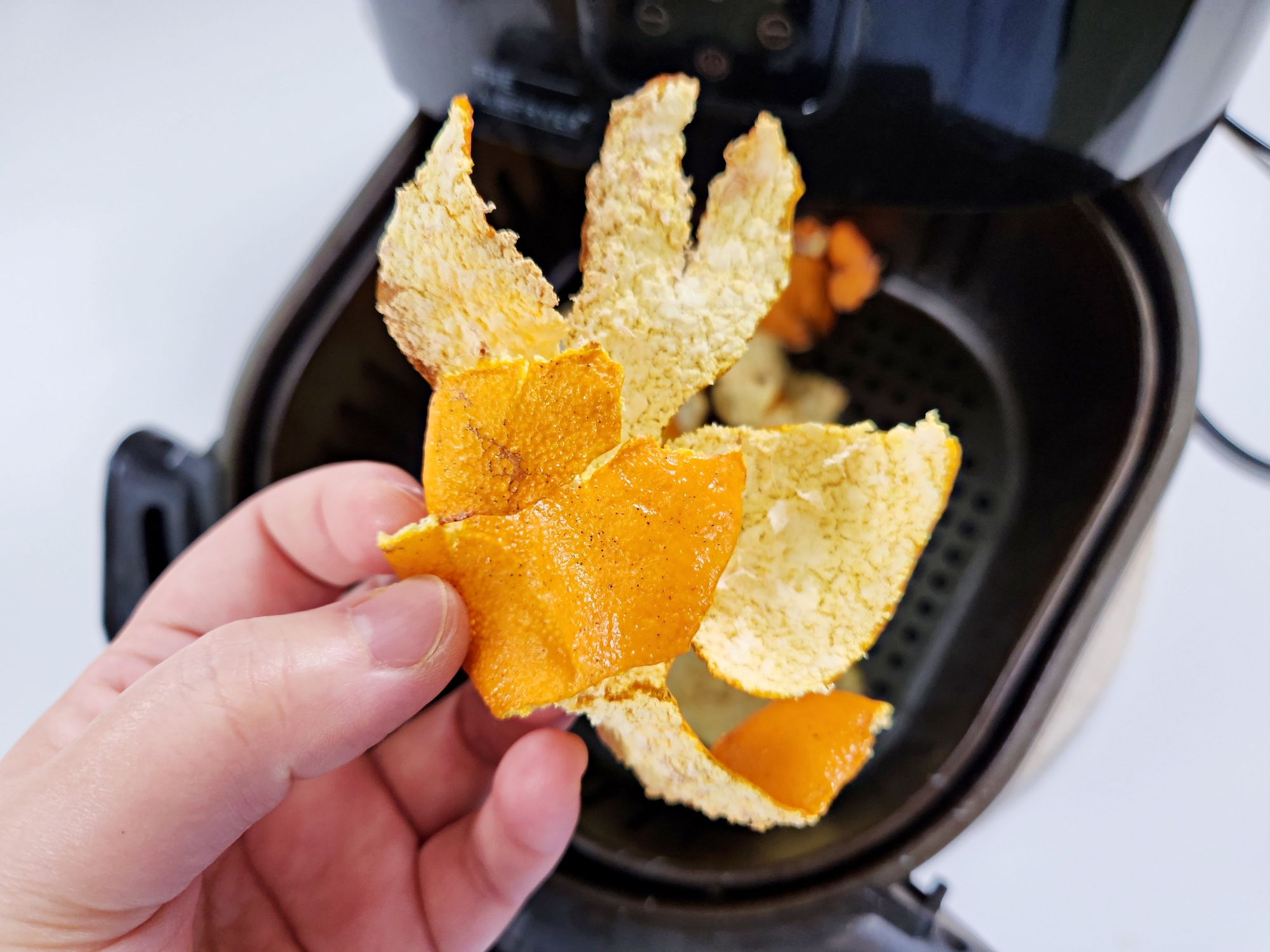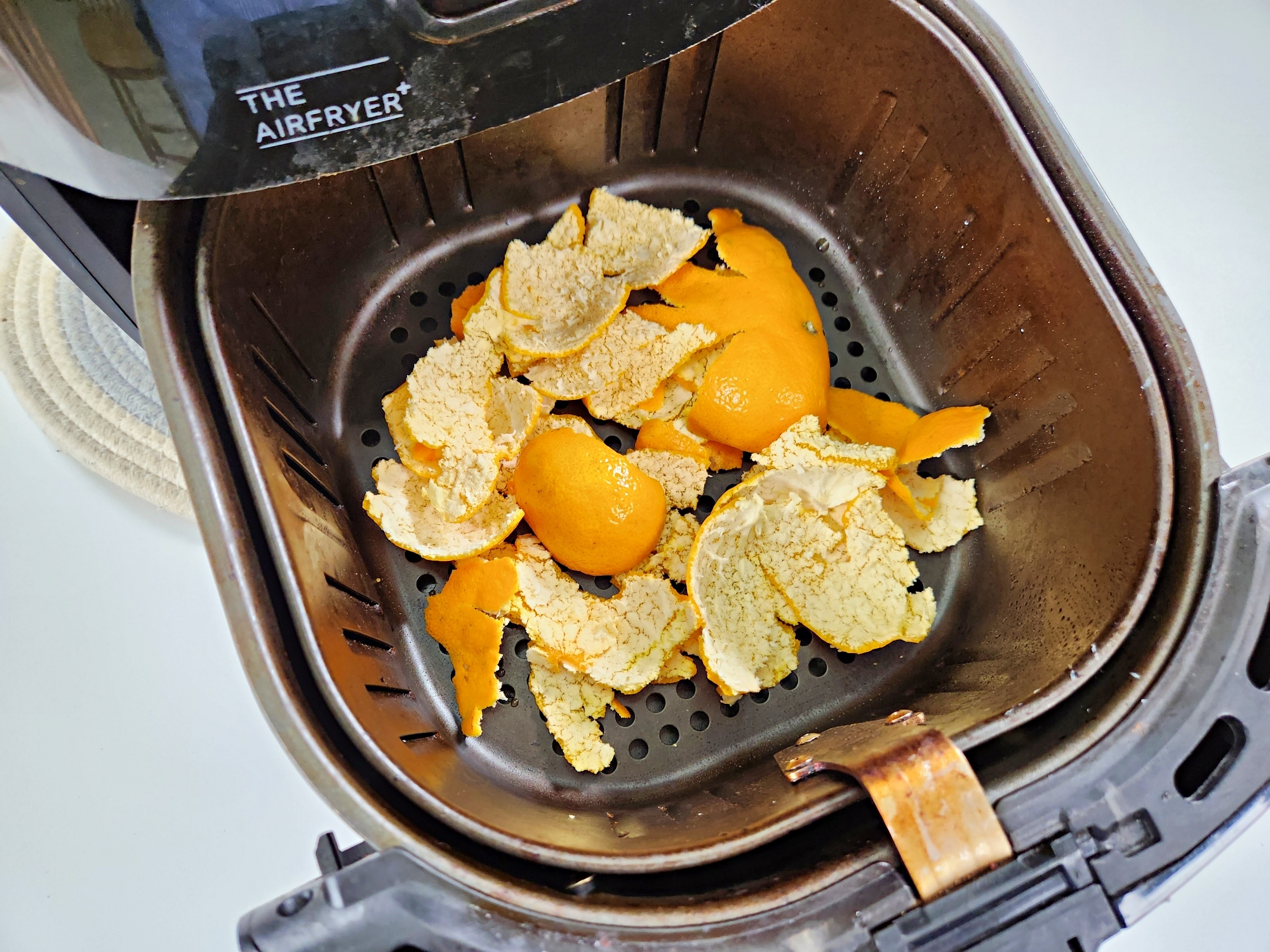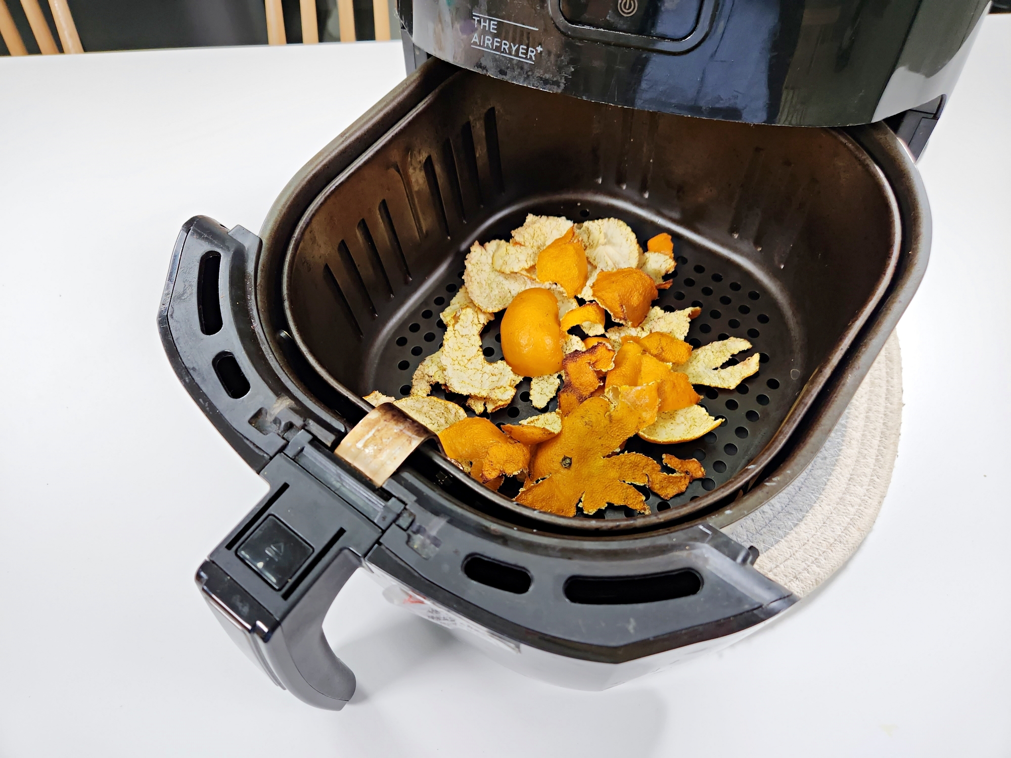 에어프라이어 바스켓에 귤껍질을 넣어요.