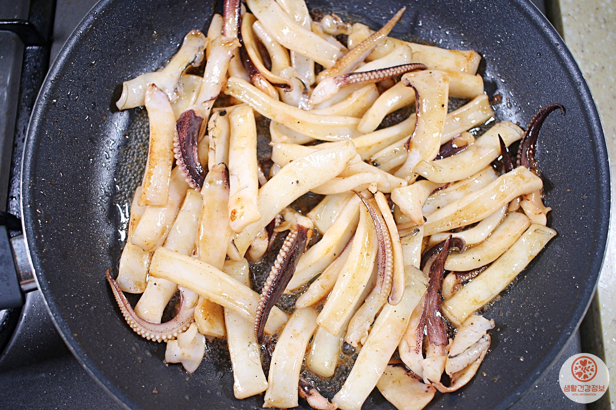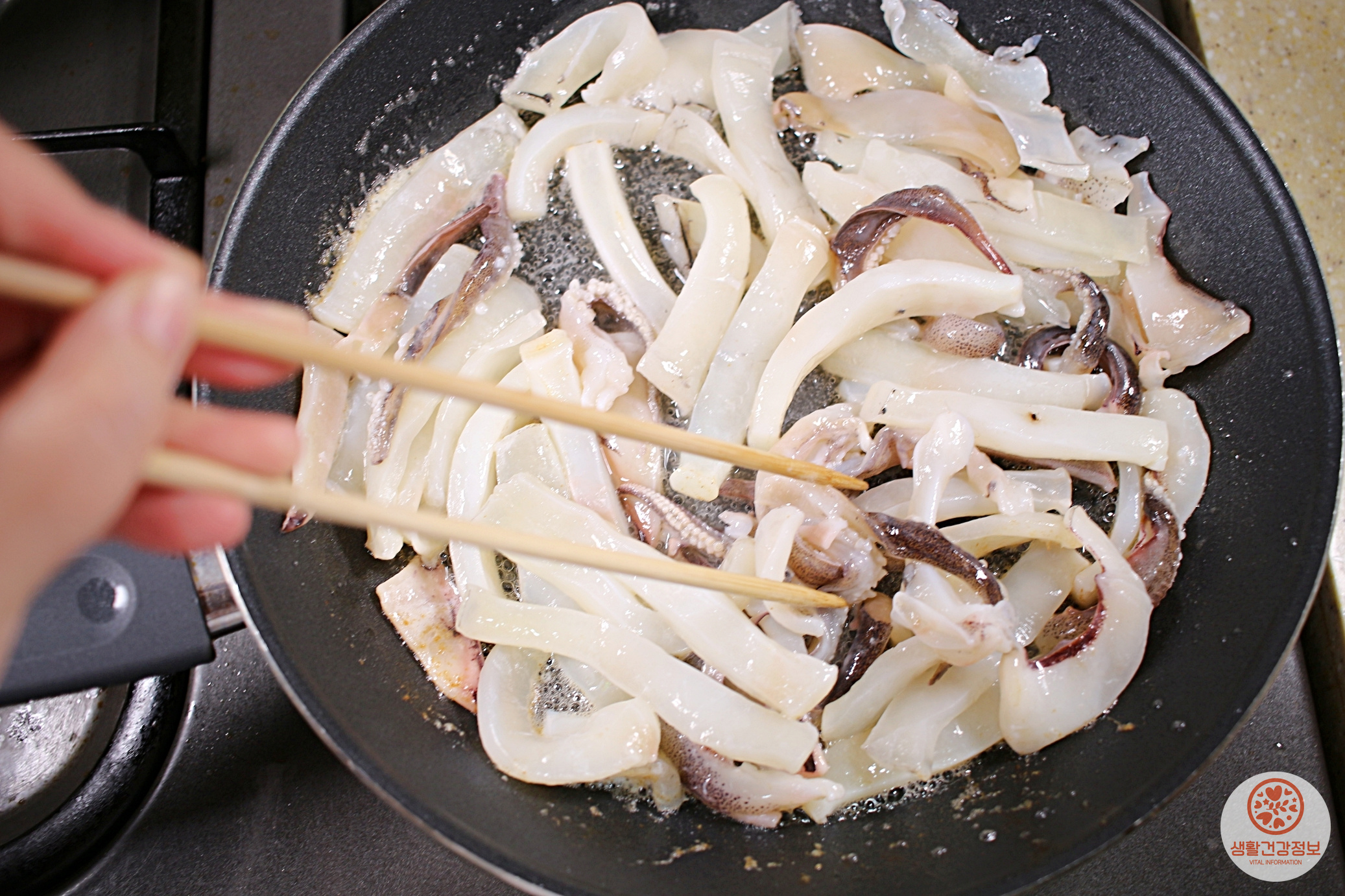오징어를 오래 볶으면 식감이 질겨지니까요.