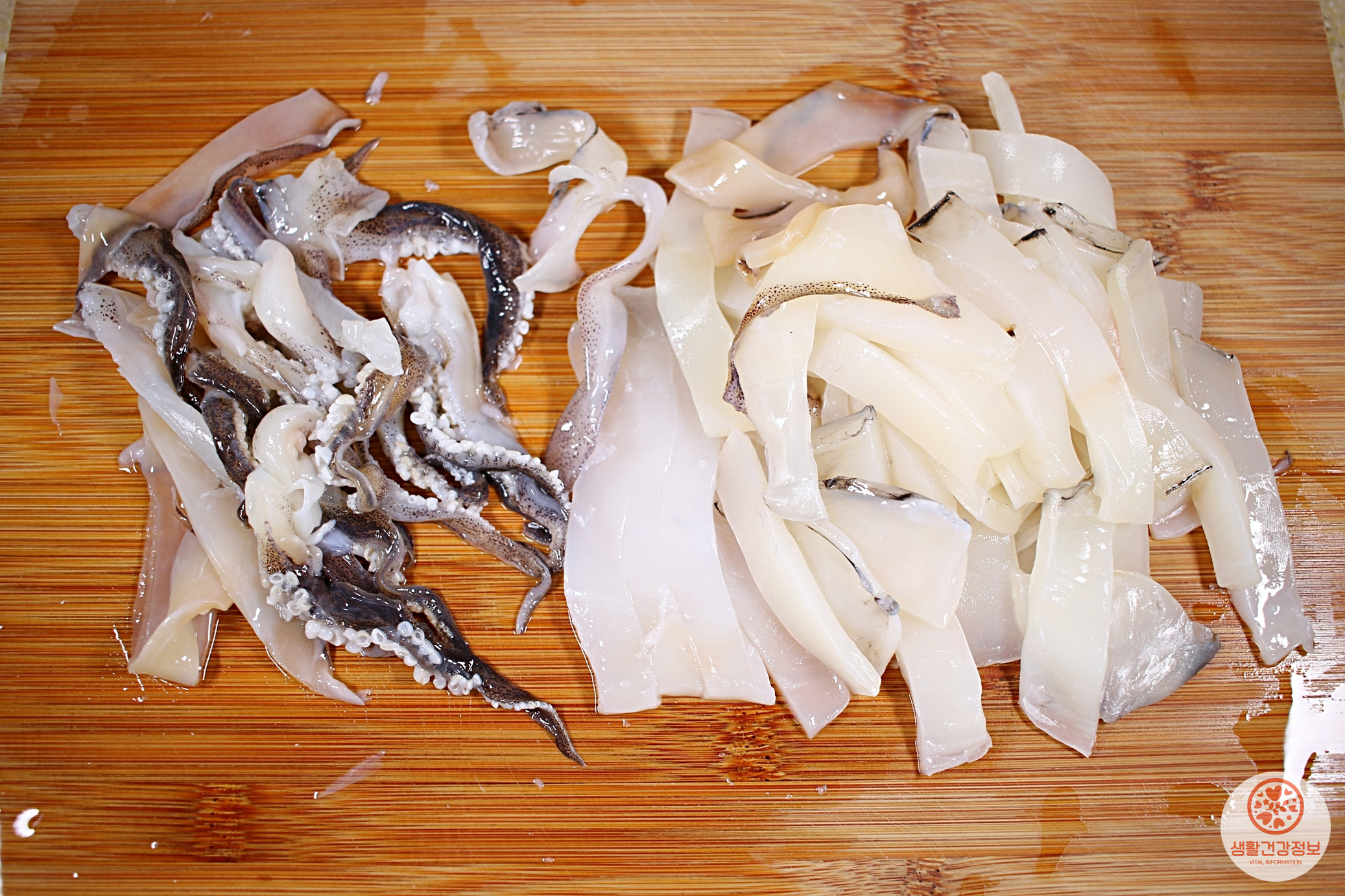 오징어는 껍질을 벗겨서 길쭉하게 썰어주세요.