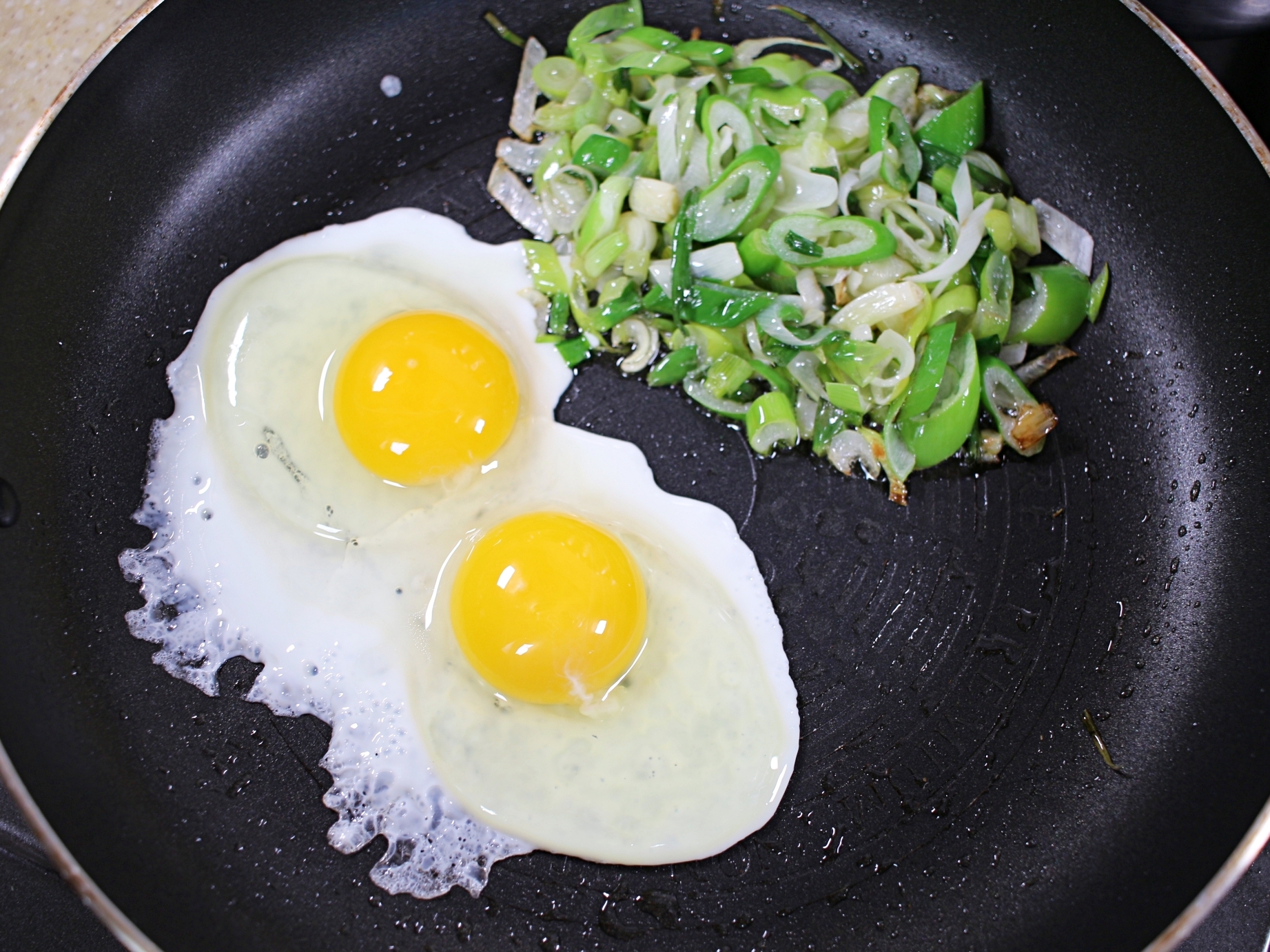 팬 한쪽에 볶음 대파를 밀어두고