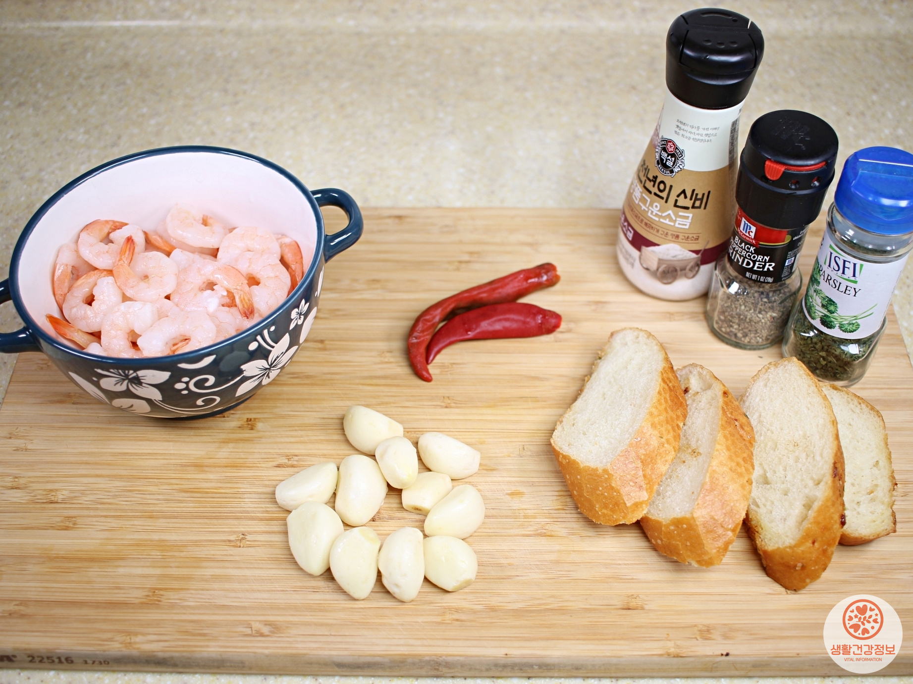 재료는 새우, 올리브유, 마늘, 페퍼론치노, 소금, 후추,