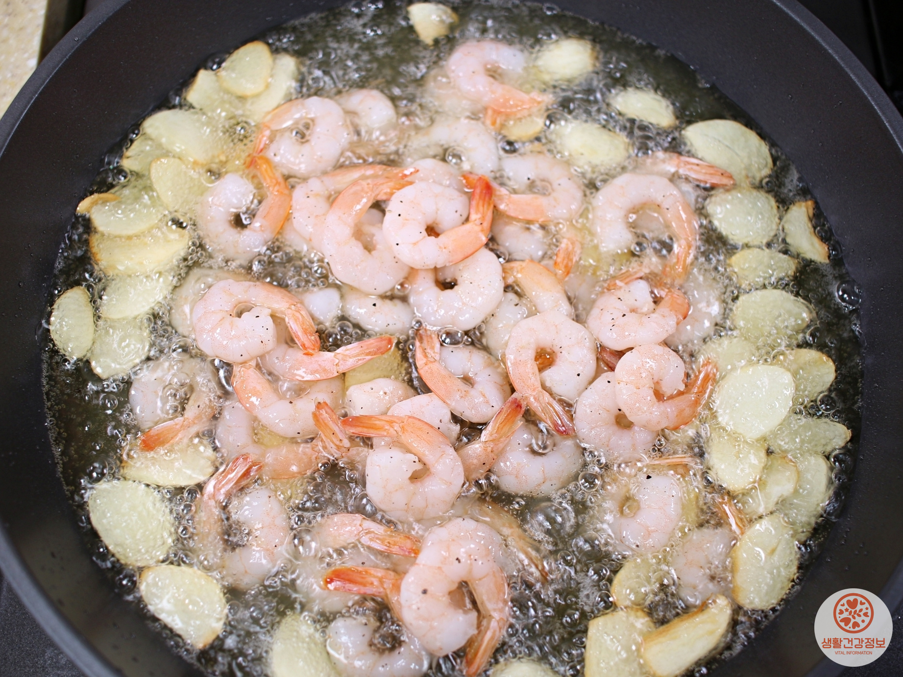 마늘이 연한 갈색이 되면 새우를 넣고 끓여주세요.