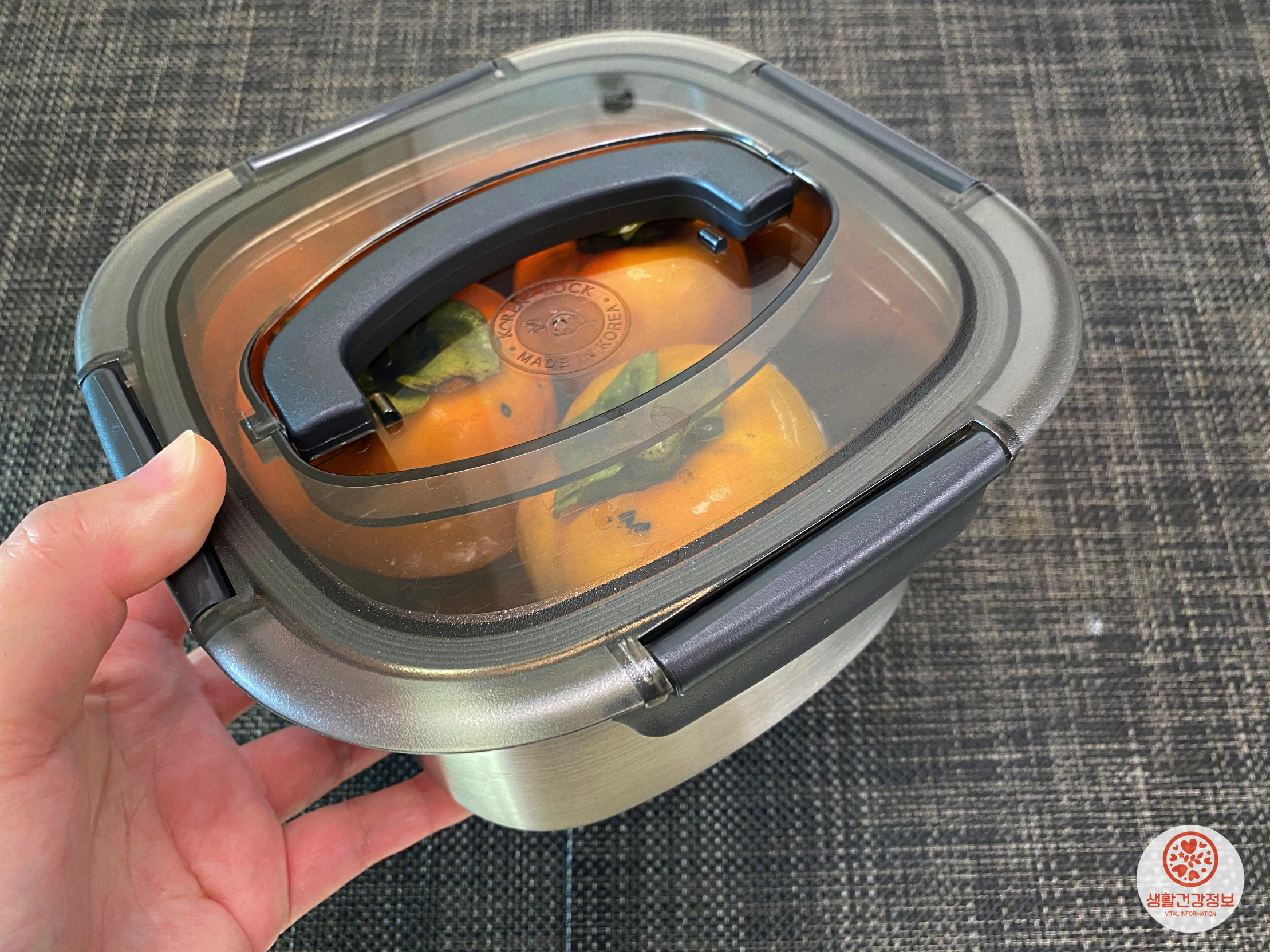그다음 밀폐용기 뚜껑을 닫고요.