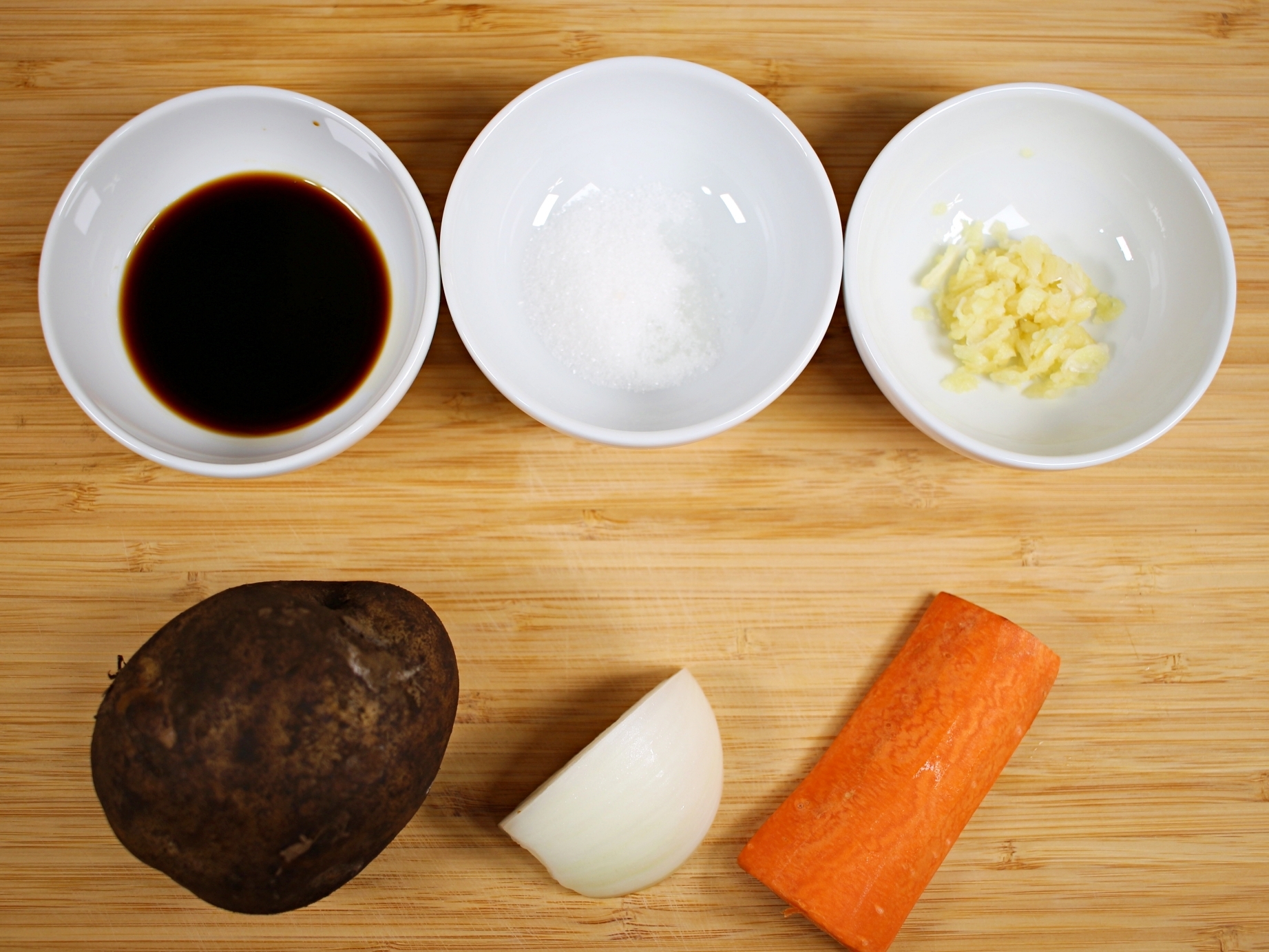 재료는 감자, 양파, 당근, 간장, 설탕, 다진마늘 준비했어요.
