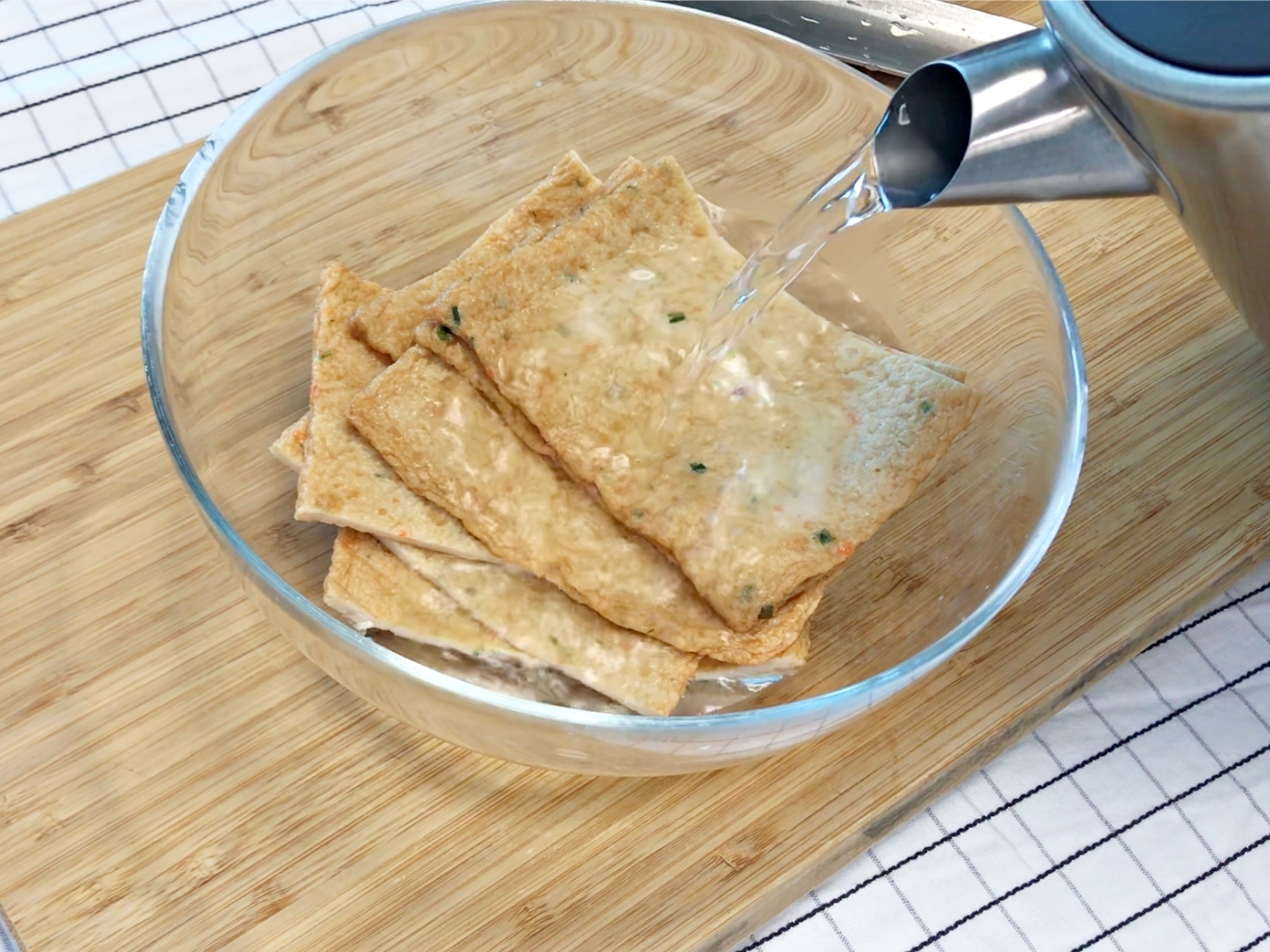 뜨거운 물에 담가 기름기를 빼 주세요.