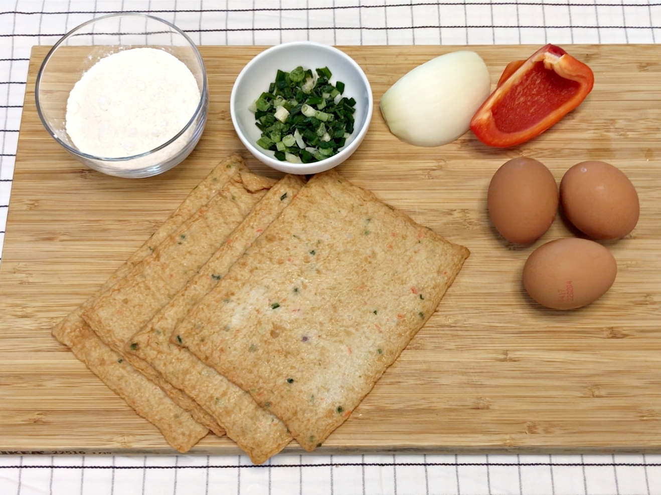 재료는 사각어묵, 달걀, 양파, 파프리카, 쪽파, 밀가루에요.