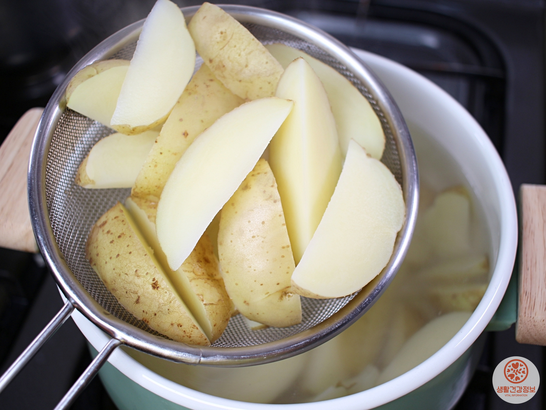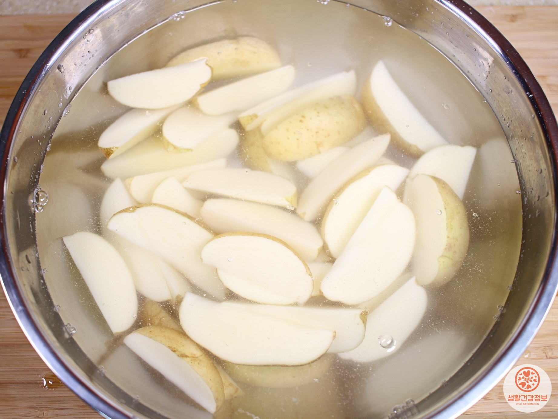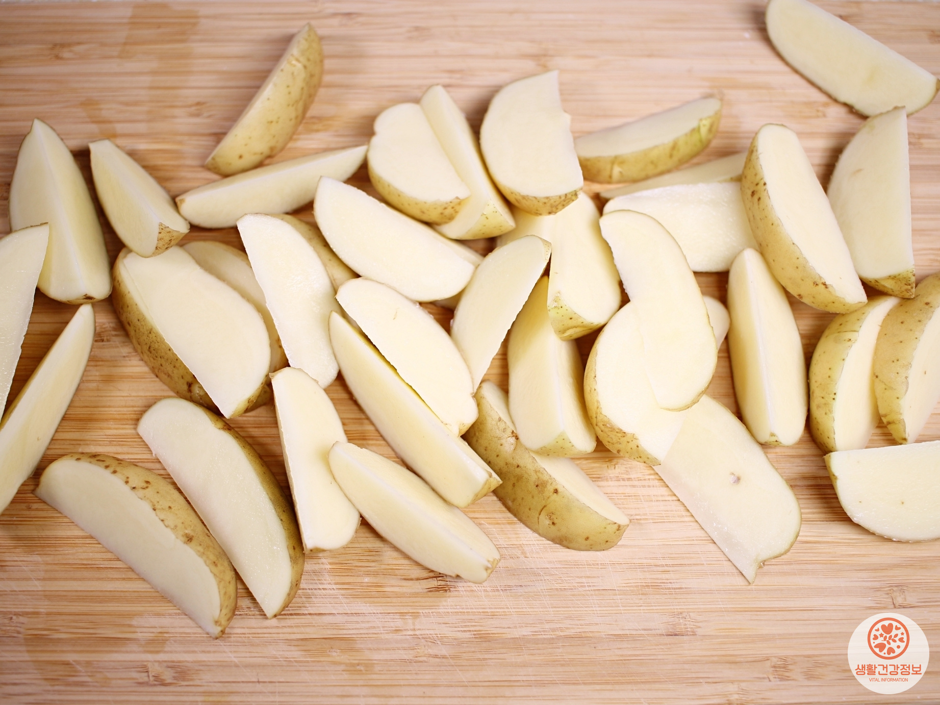 세척한 감자를 반달 모양으로 썰어주시고요.