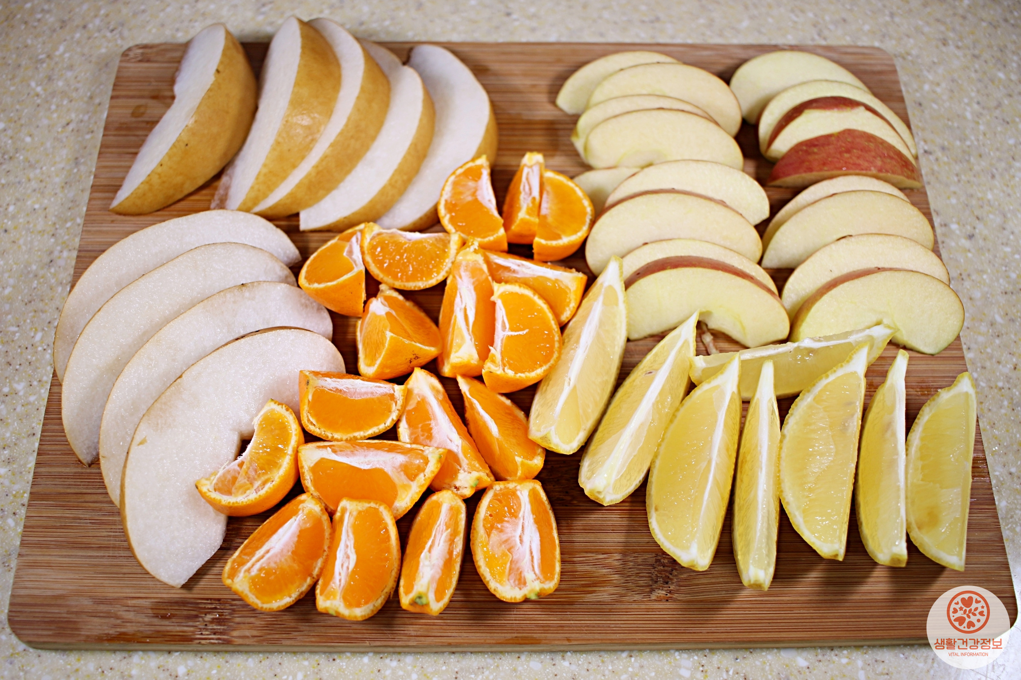 세척한 과일은 큼직하게 잘라서 씨를 제거해주세요.