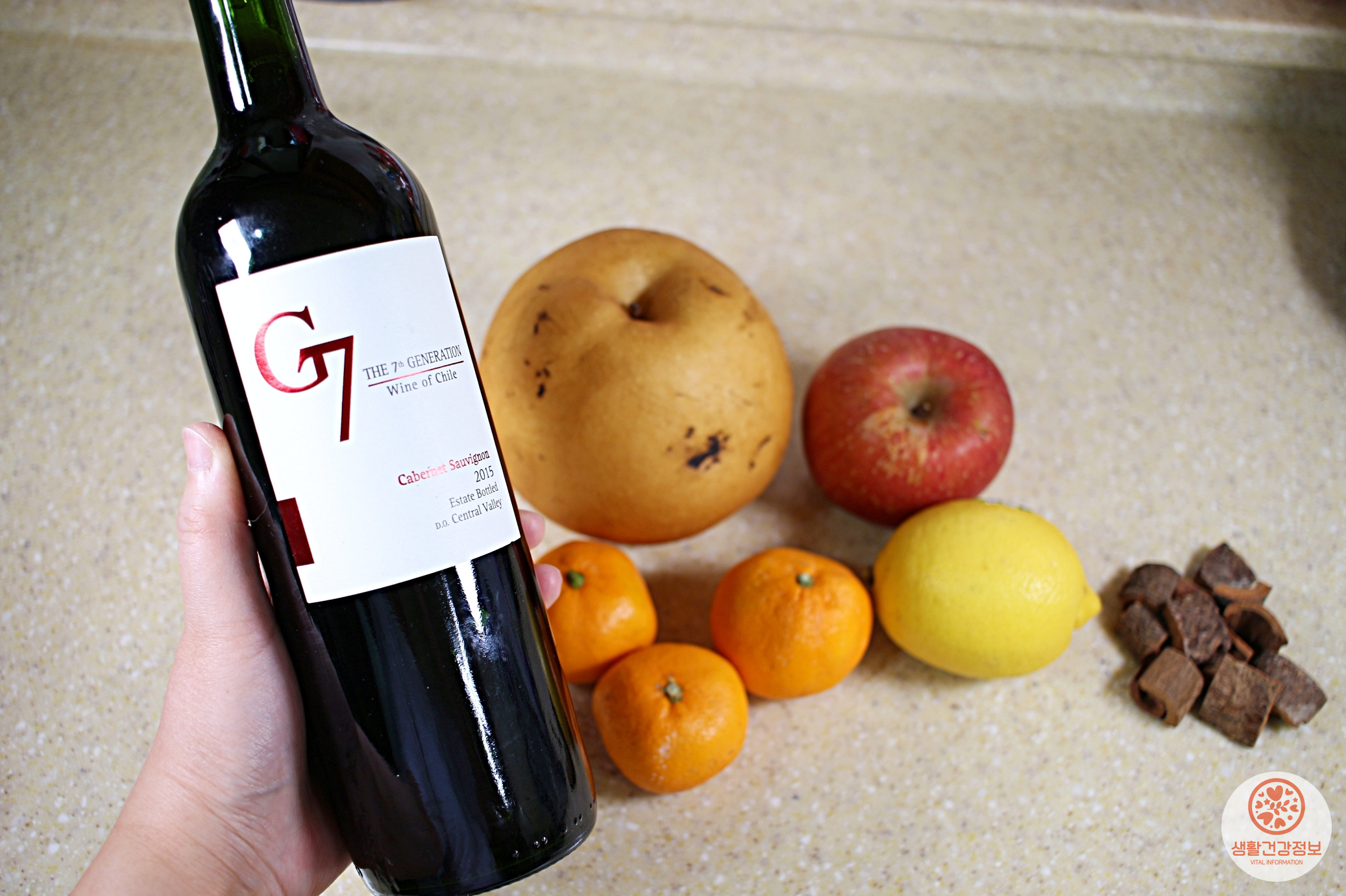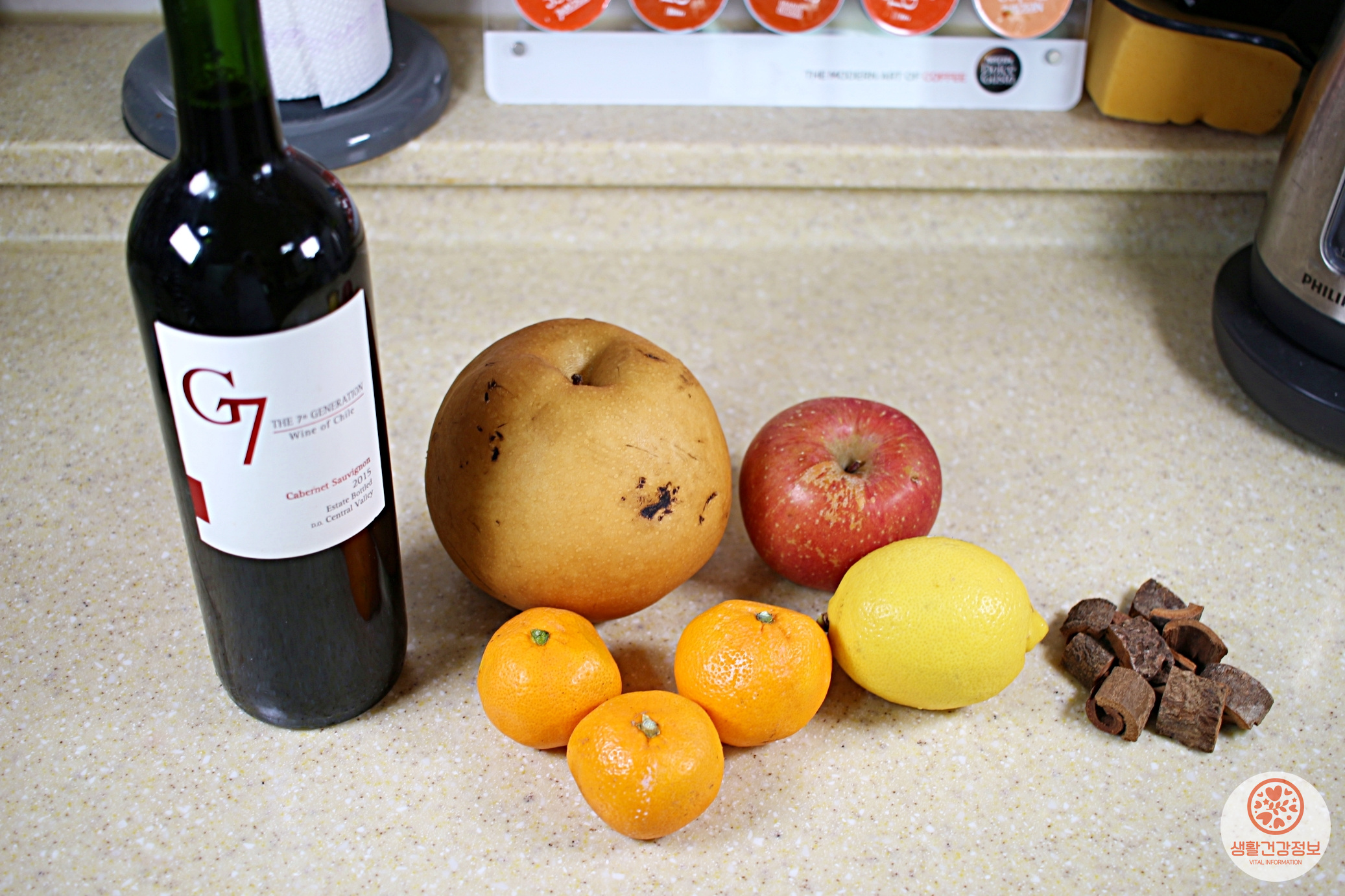 재료는 레드와인, 사과, 배, 귤, 레몬, 계피 준비했어요.