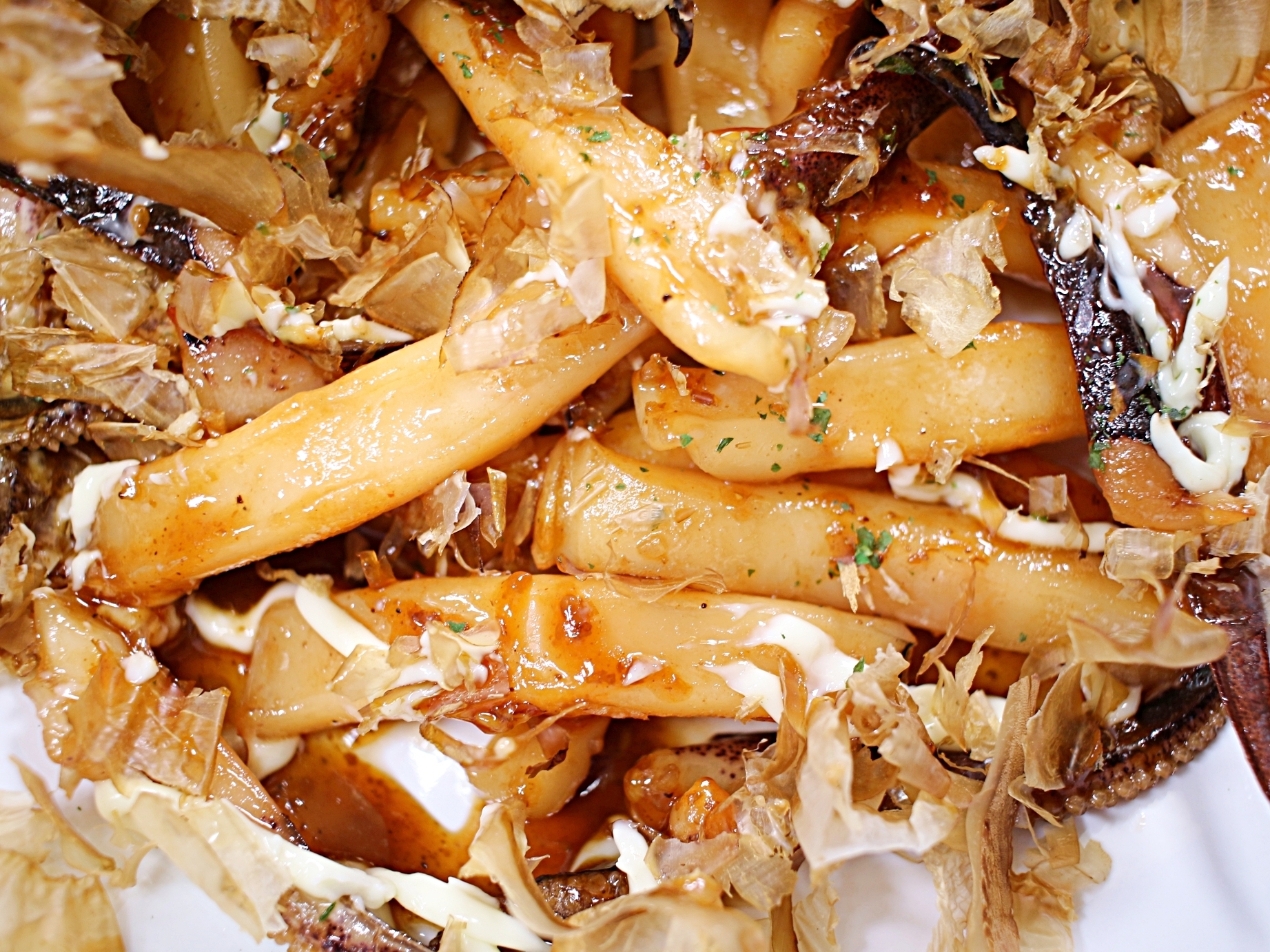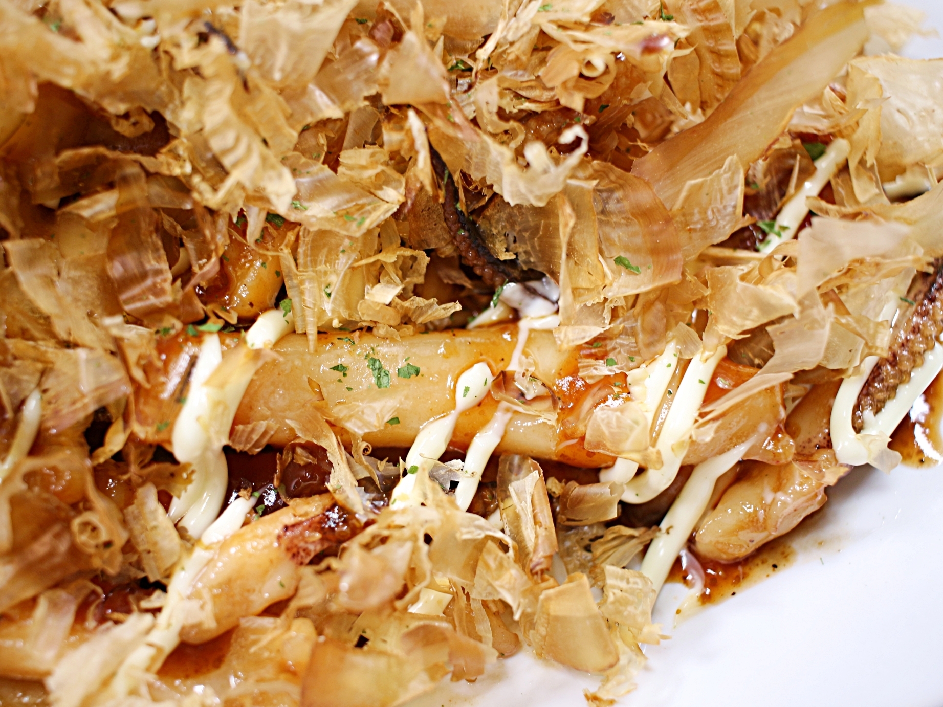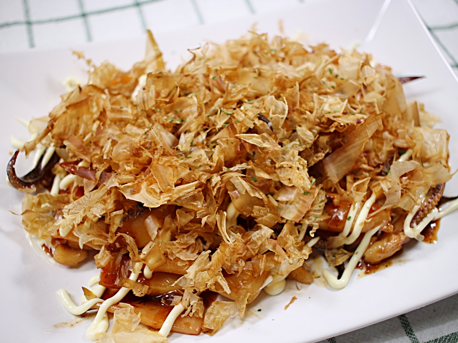 가쓰오부시 위에 마요네즈, 돈까스소스 뿌리고