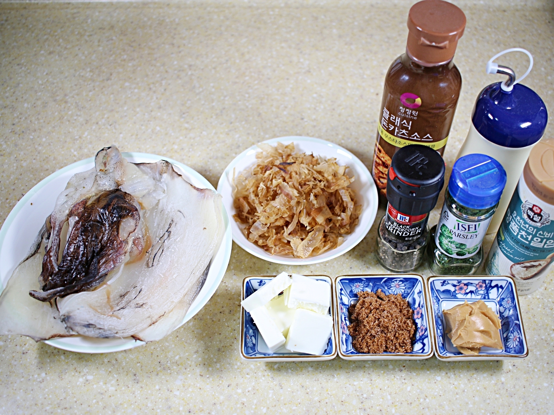 재료는 오징어, 버터, 땅콩버터, 가쓰오부시,