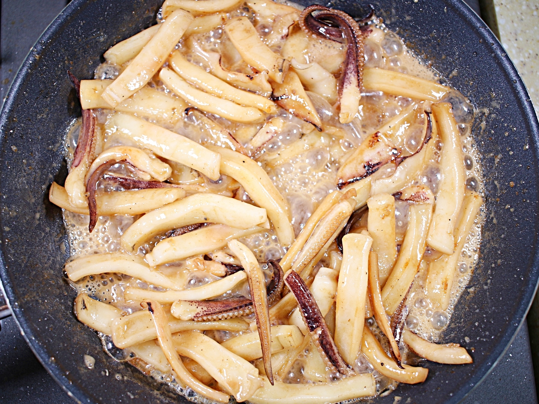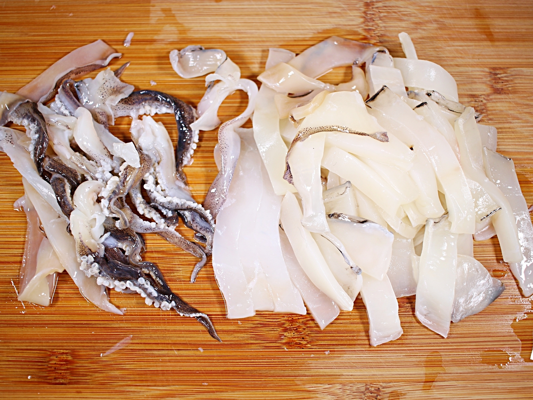 오징어는 껍질을 벗기고 길게 썰어주세요.