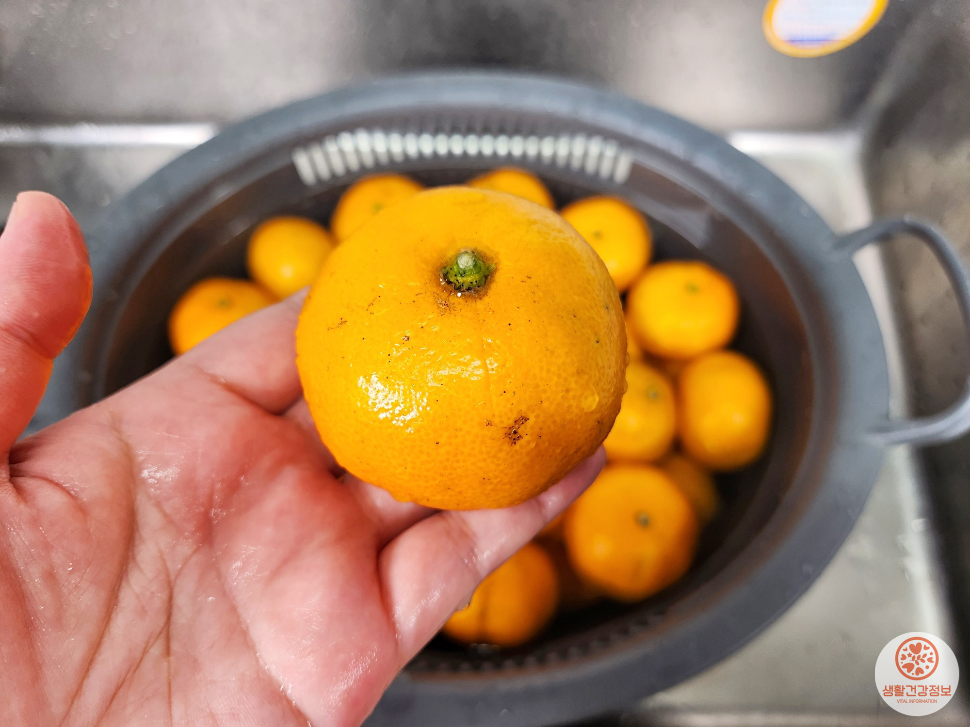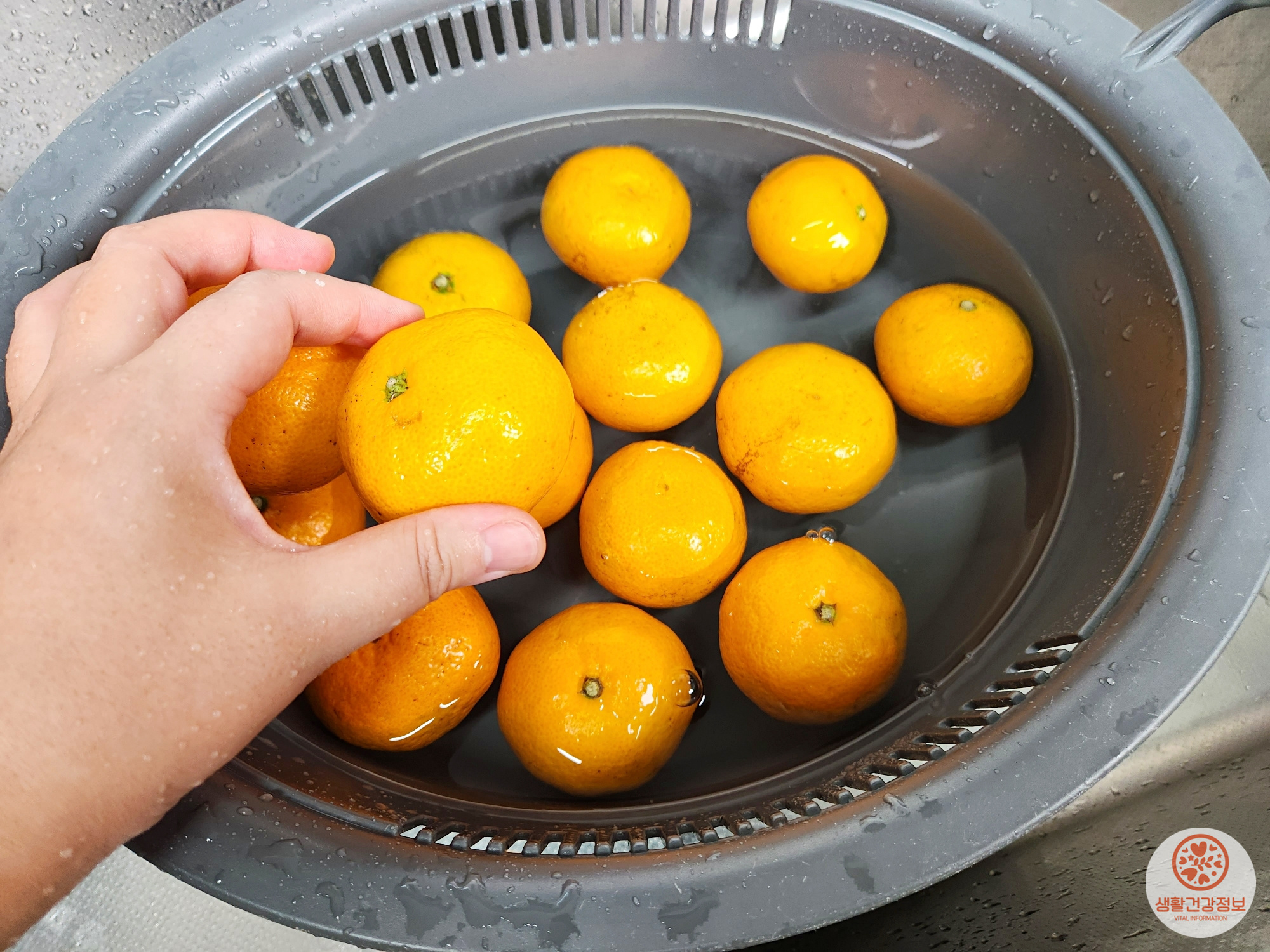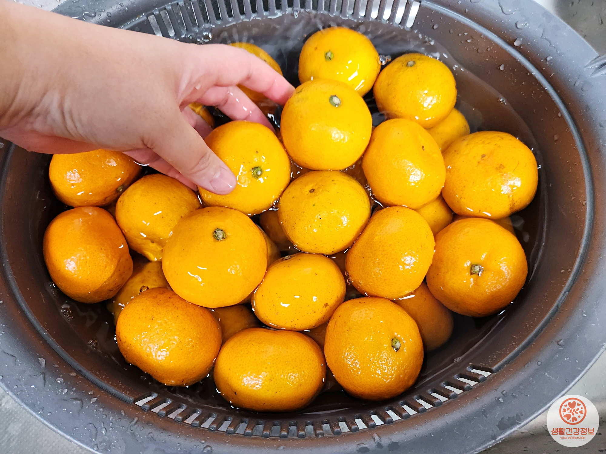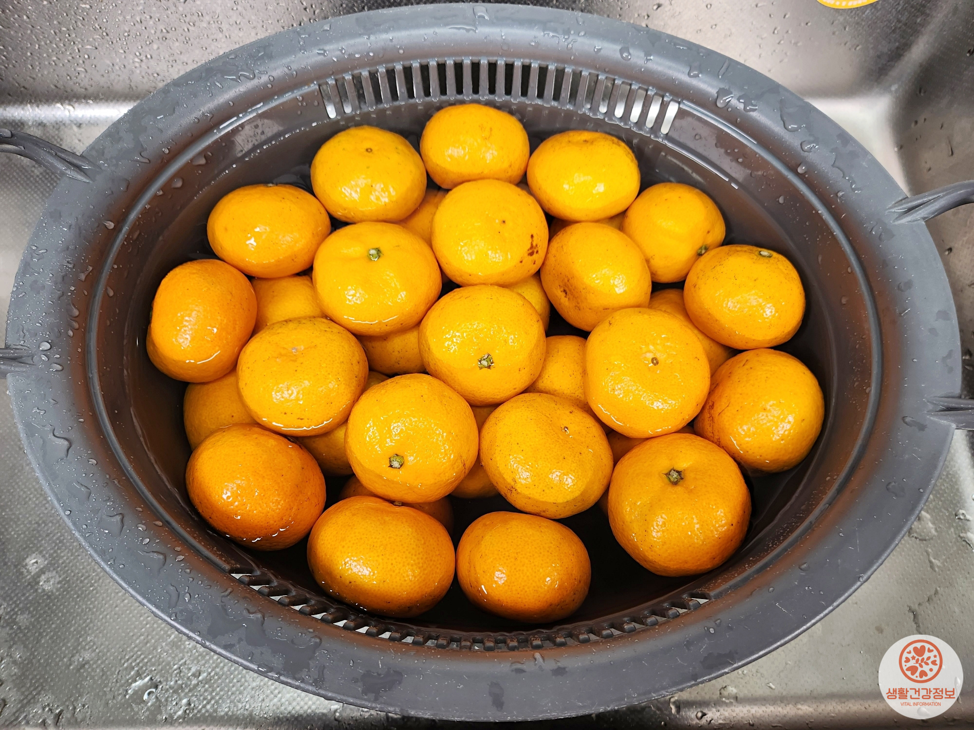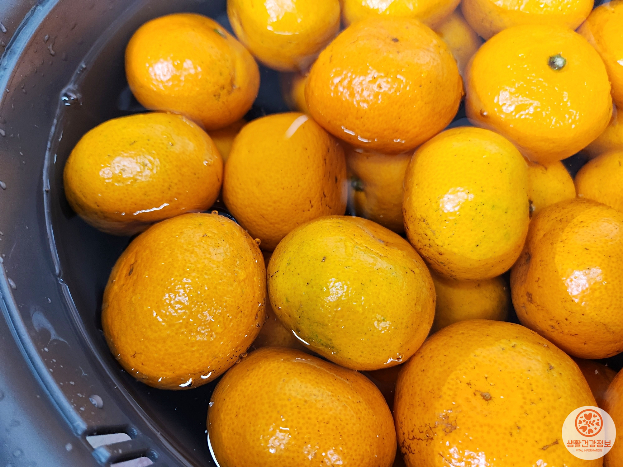 그다음은 귤을 소금물에 세척해요.