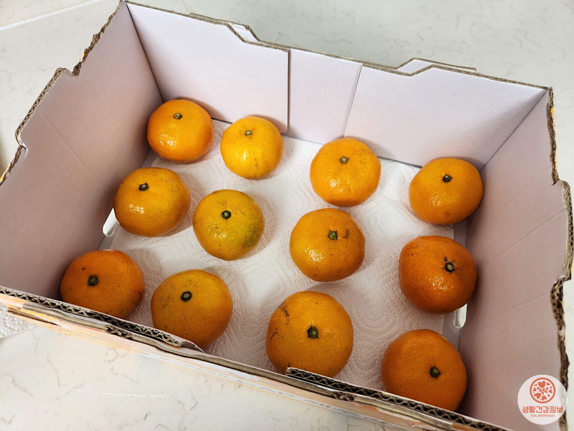 먼지를 털어낸 귤상자에 키친타월을 깔고(습기 흡수용)