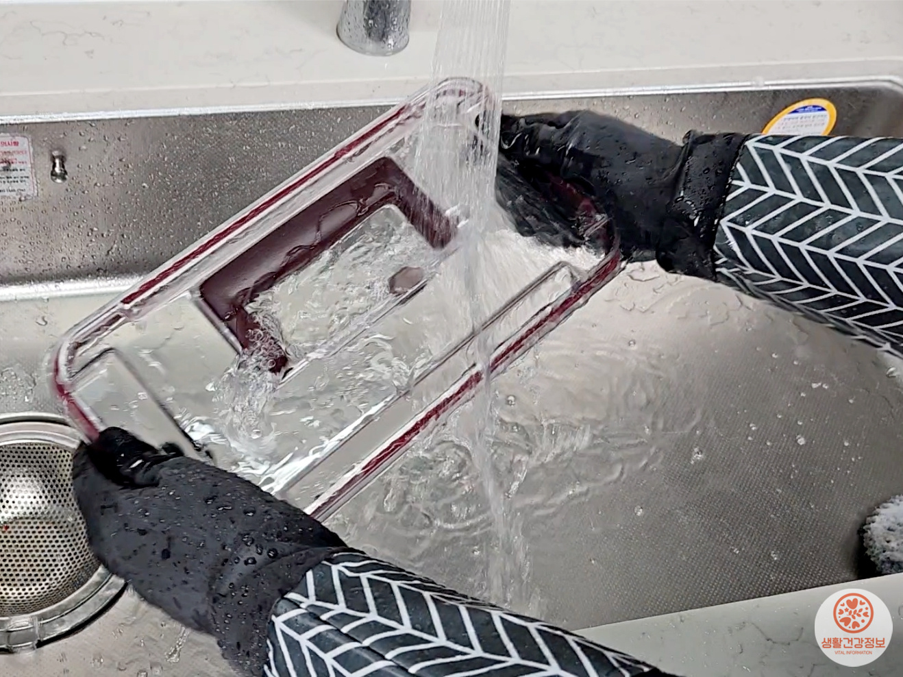김치통을 비우고 주방세제로 닦는건 기본이죠.