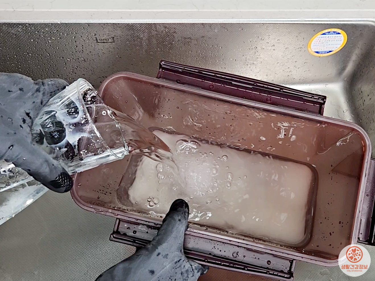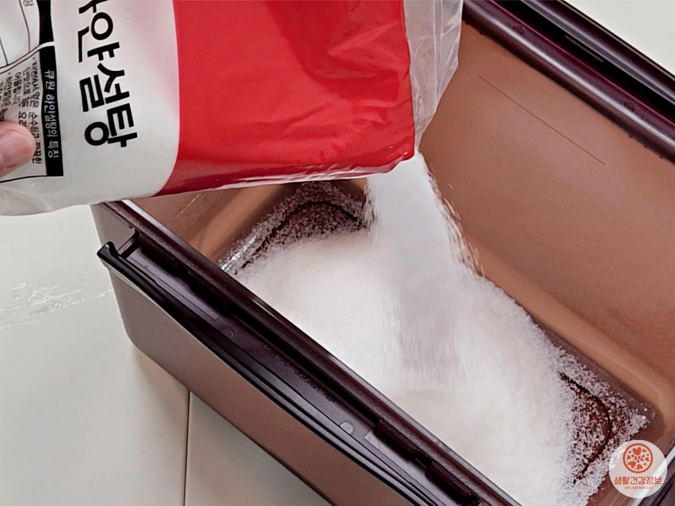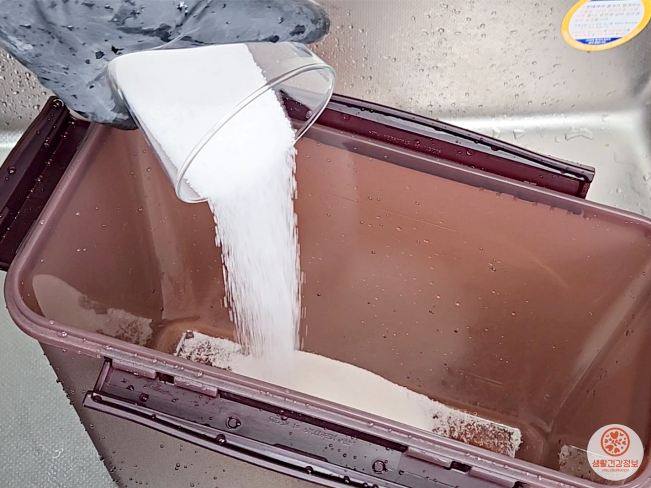 주방세제로 세척한 김치통에 설탕을 부어주세요.