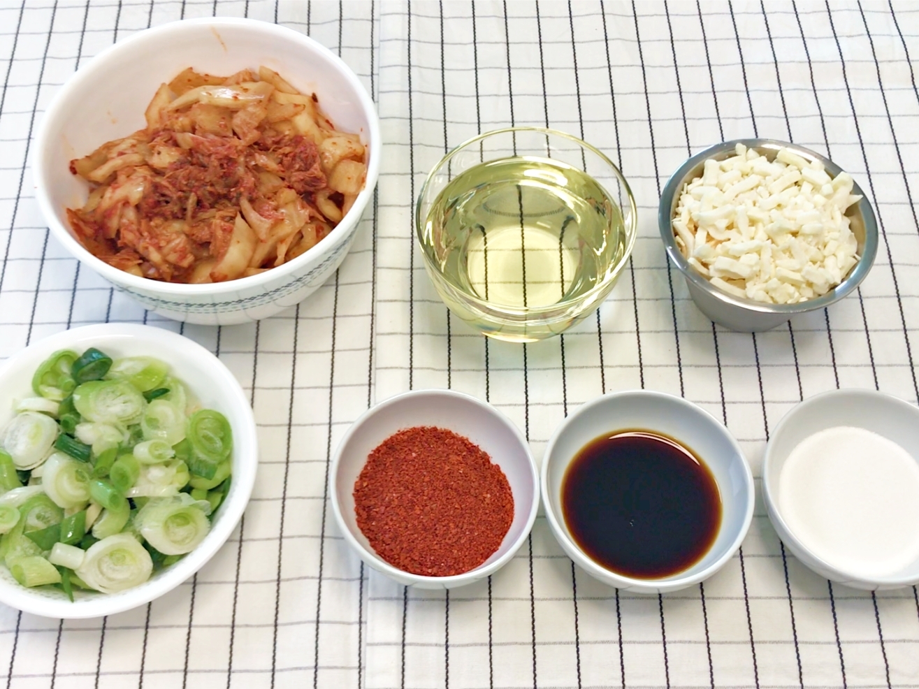 재료는 찬밥, 신김치, 치즈, 대파, 식용유,