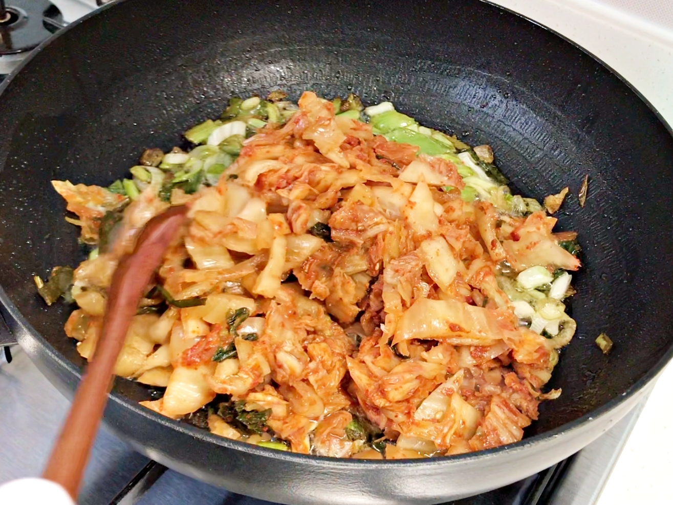은은한 대파향이 퍼지면 썰어놓은 김치를 넣고 볶아주세요.