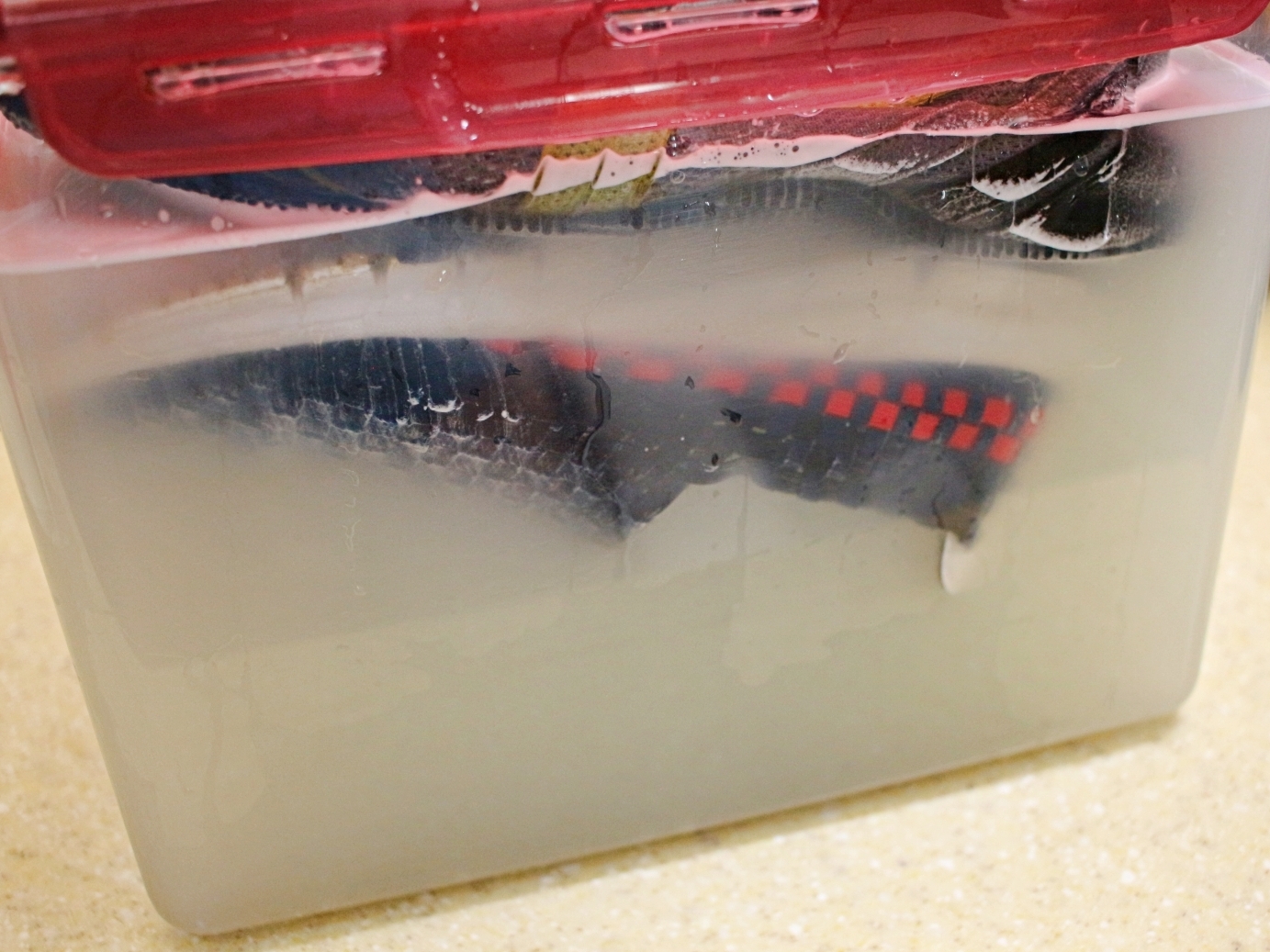 세제물 채운 김치통에 퐁당~ 담가주세요.