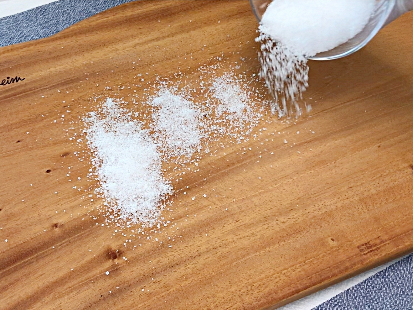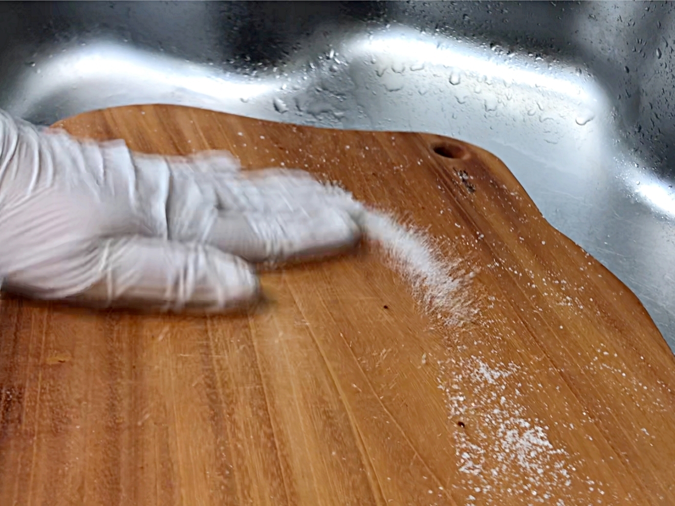 나무도마에 뿌리고 손으로 문질러서 닦아요.