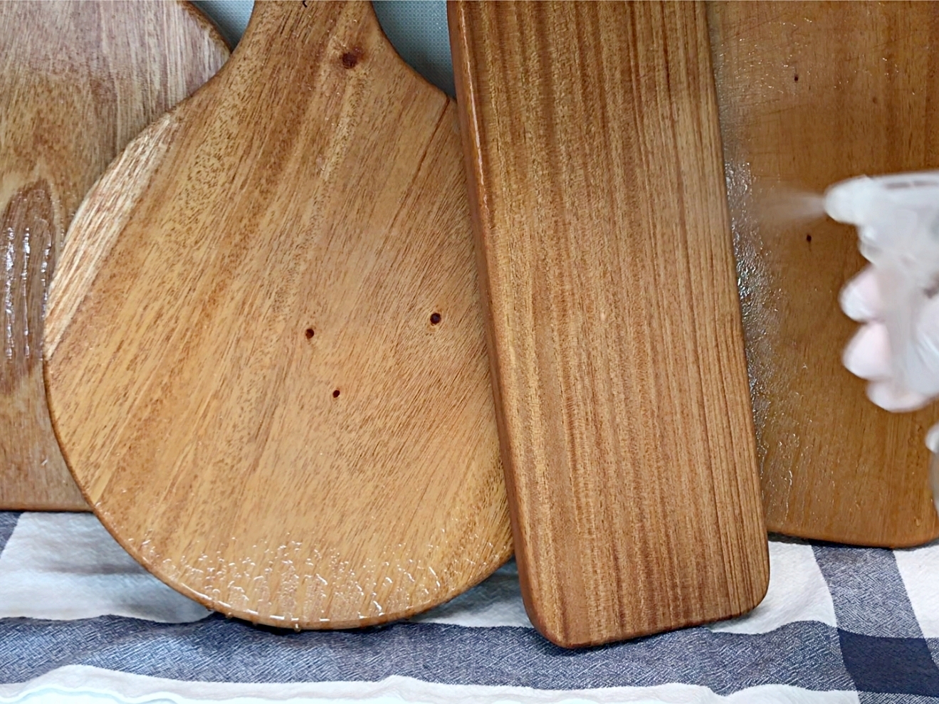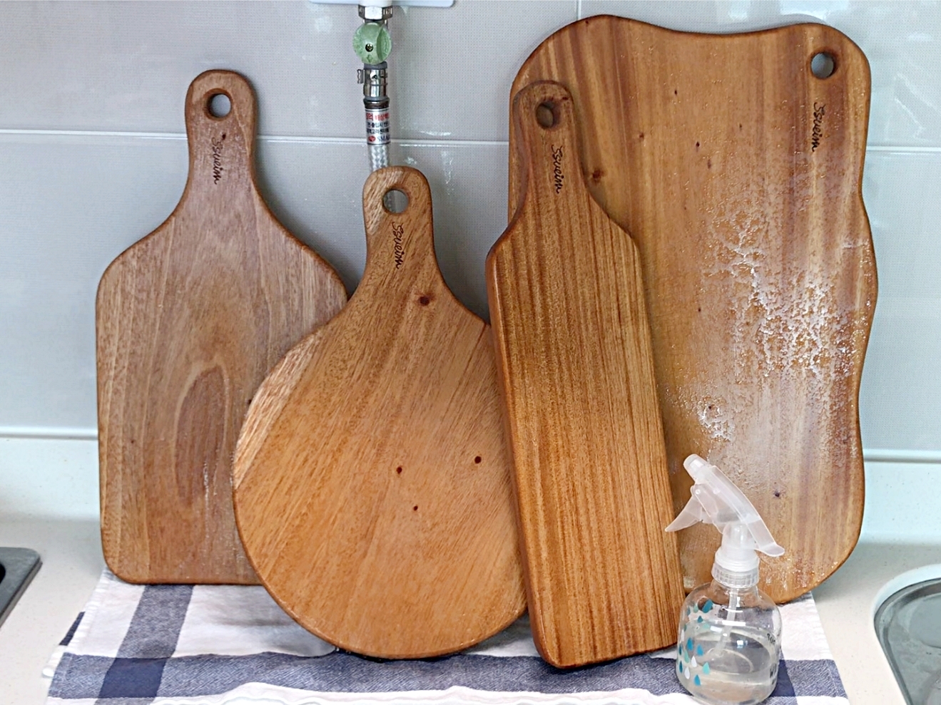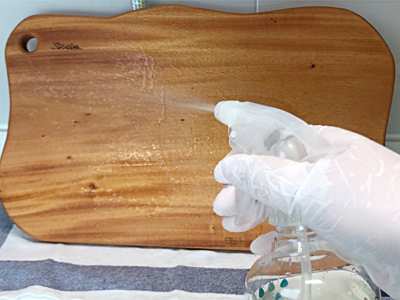 분무기에 담아서 나무도마에 골고루 뿌려주세요.