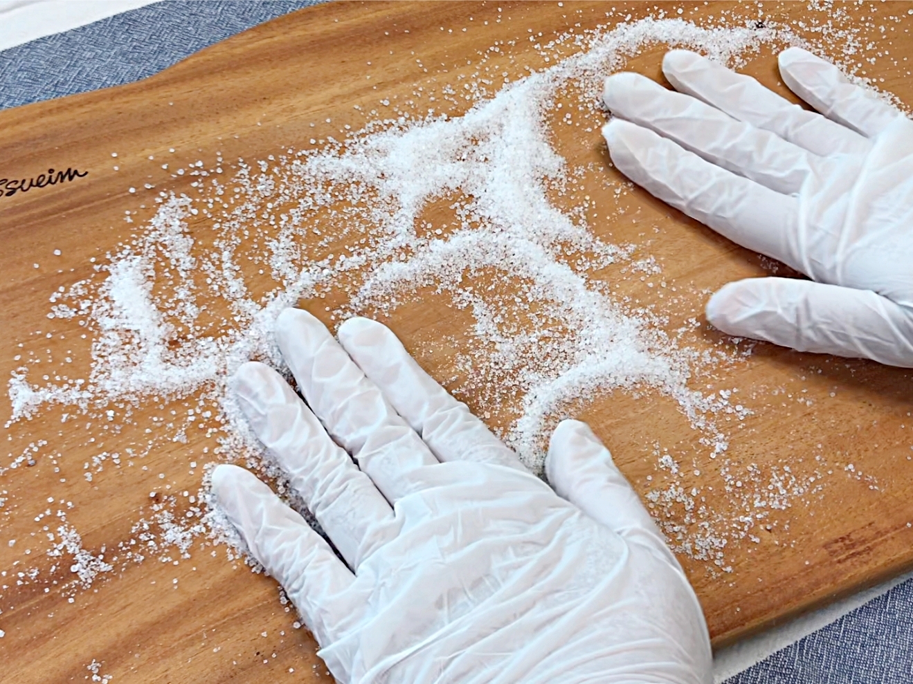 나무도마에 뿌리고 손으로 문질러서 닦아요.