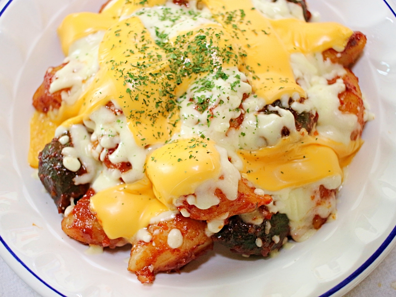 치즈가 녹으면 초간단 송편피자떡볶이가 완성돼요.