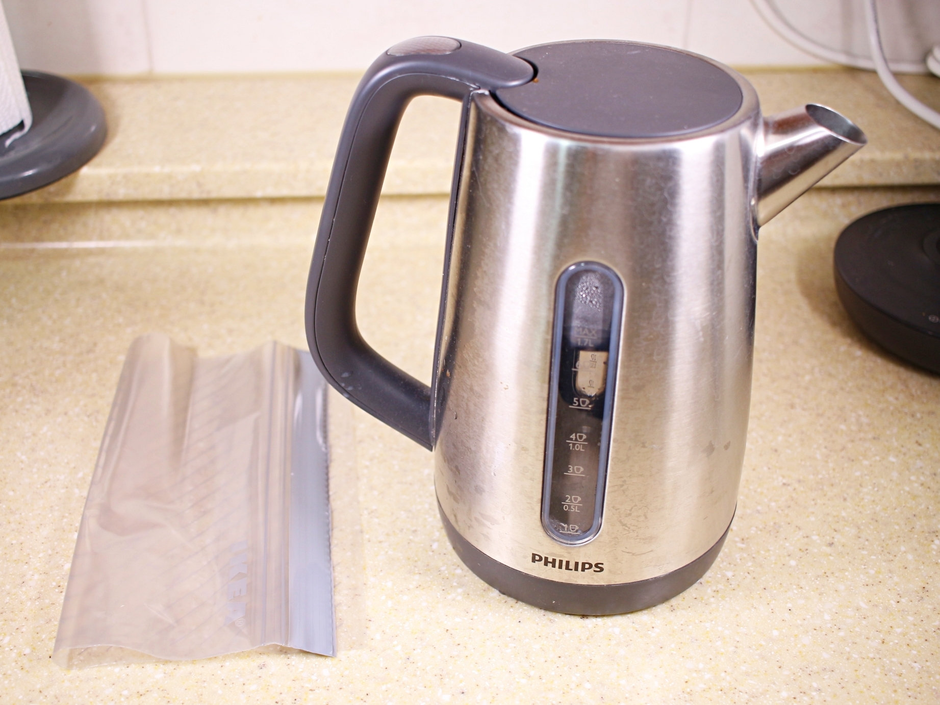 전기포트, 튼튼한 지퍼백, 뜨거운 물을 담을 그릇 끝.