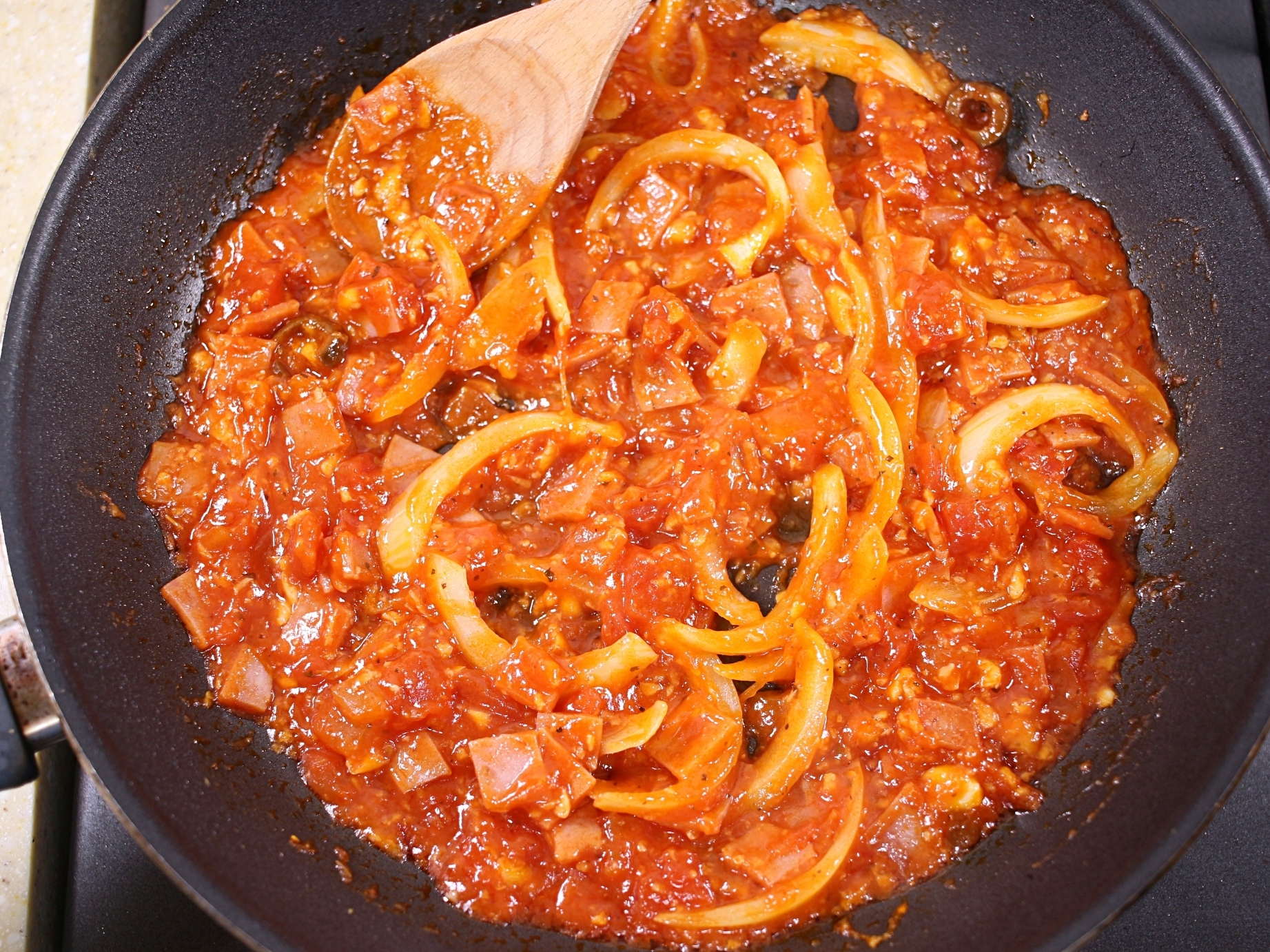 토마토소소를 넣고 골고루 섞어가며 볶아주세요.