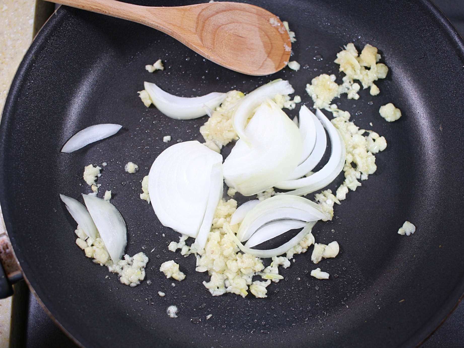 얇게 채 썬 양파를 넣고 볶아주세요.