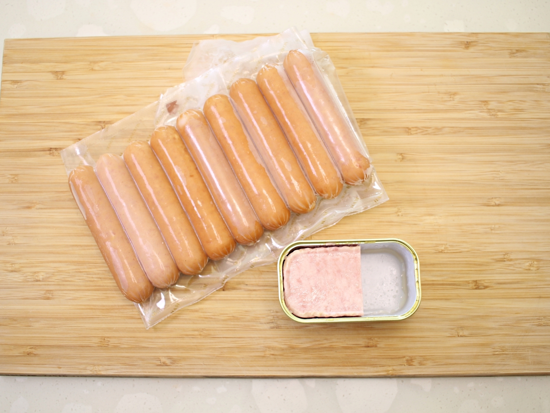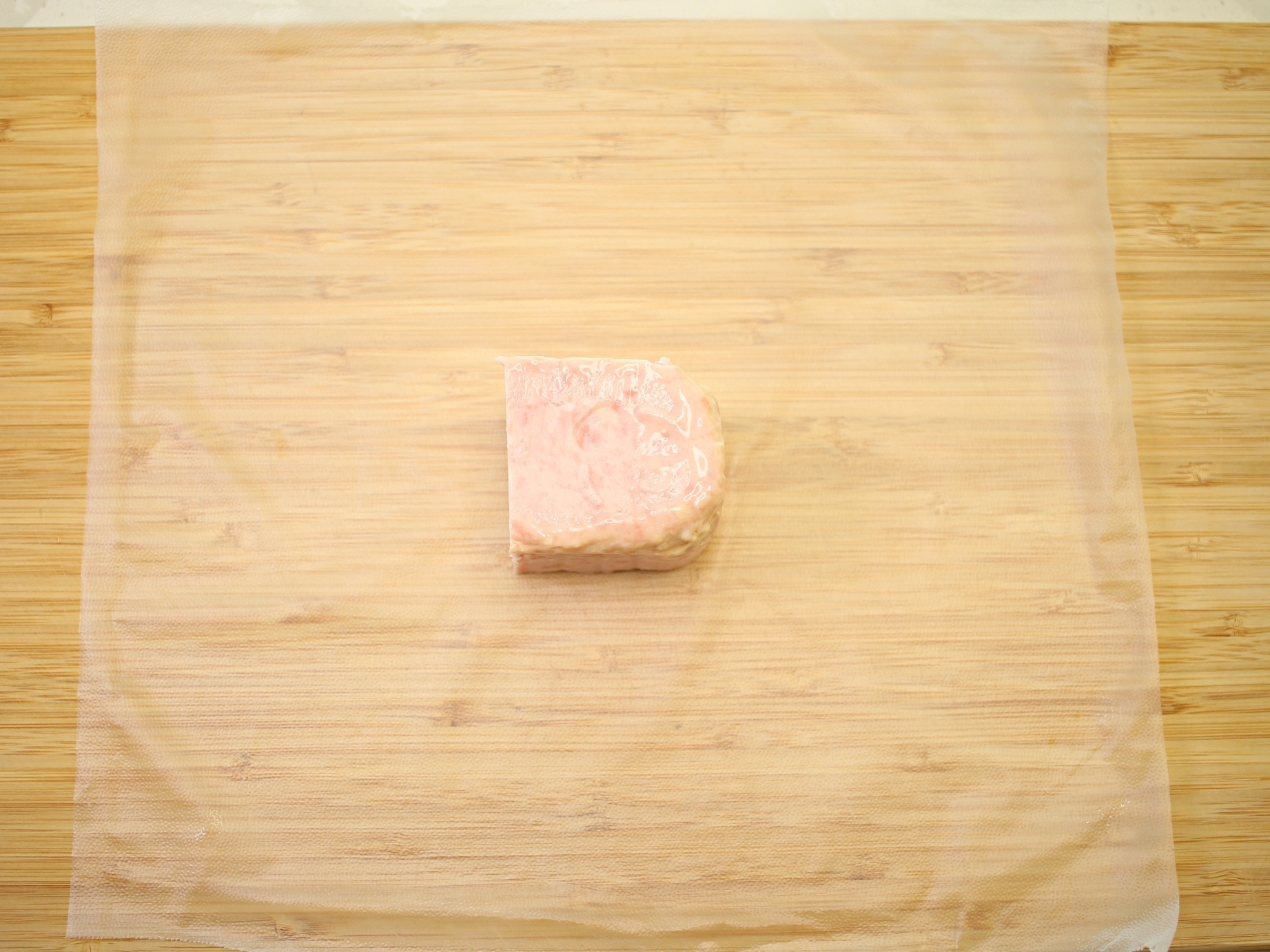 깨끗한 도마 위에 랩을 펼치고 남은 햄을 올려주세요.