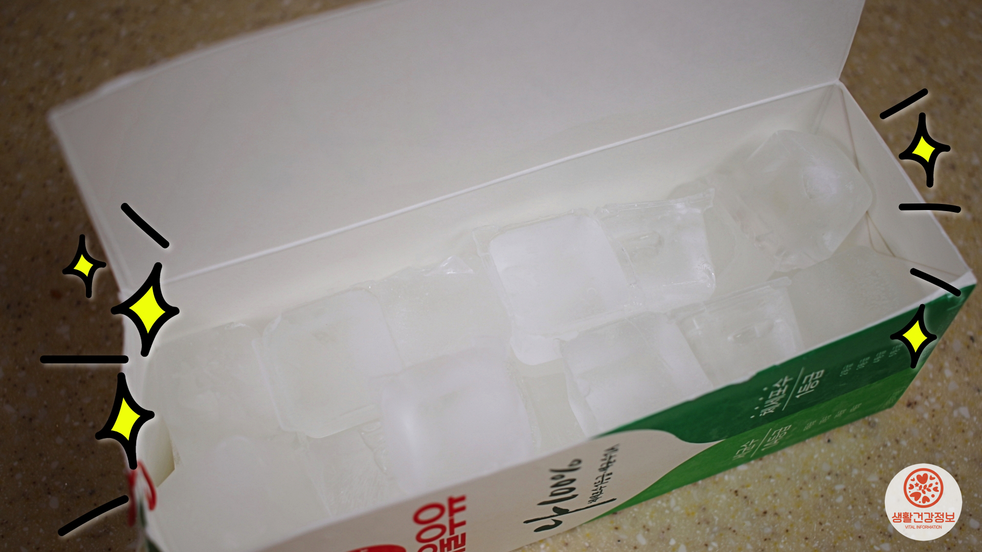 우유팩에 얼음을 담아서 냉동실에 넣고