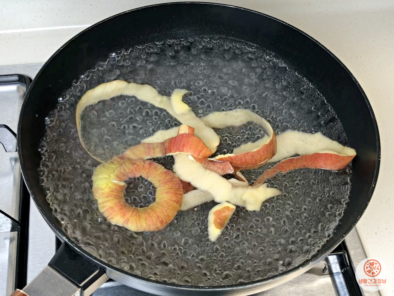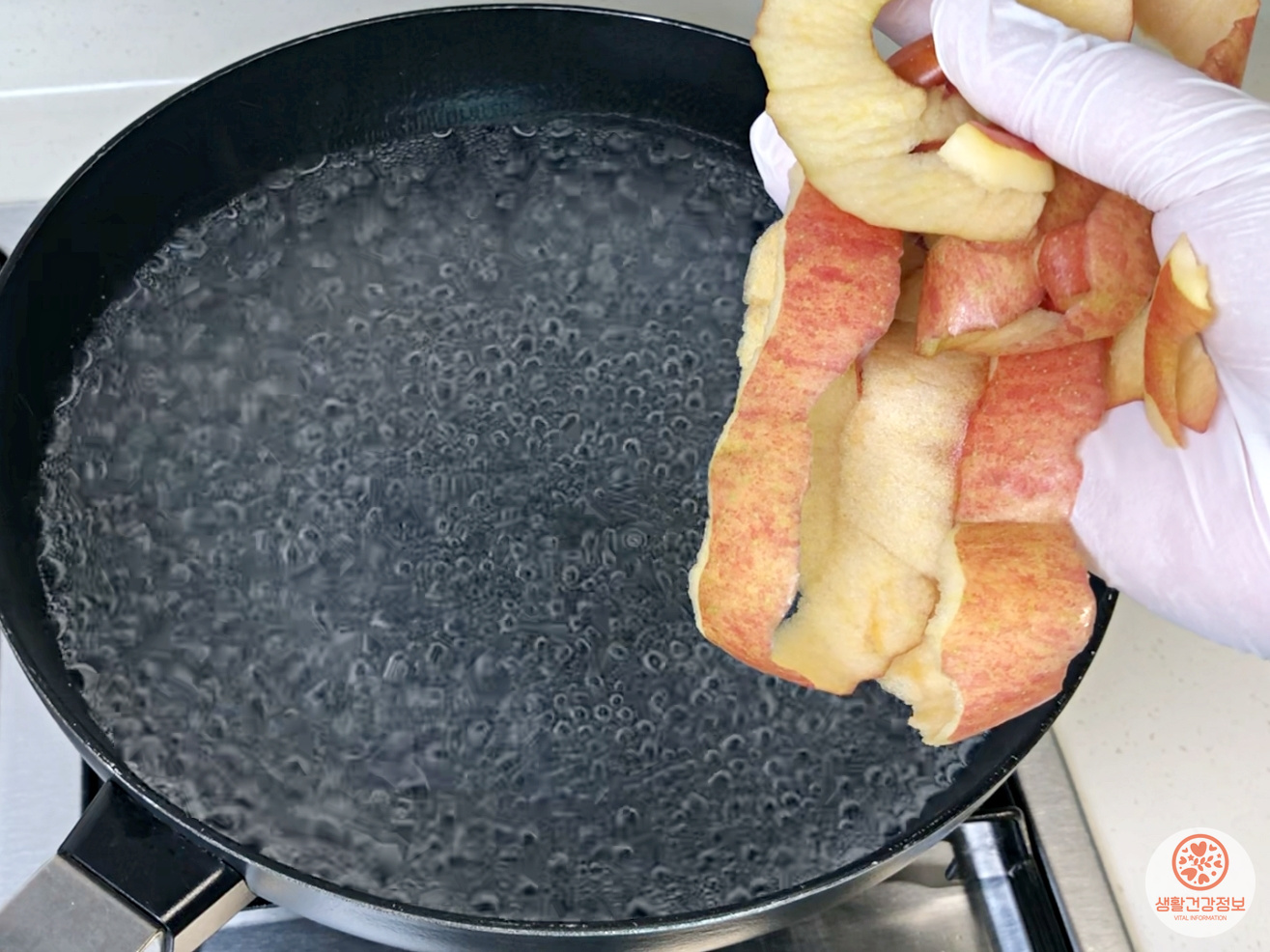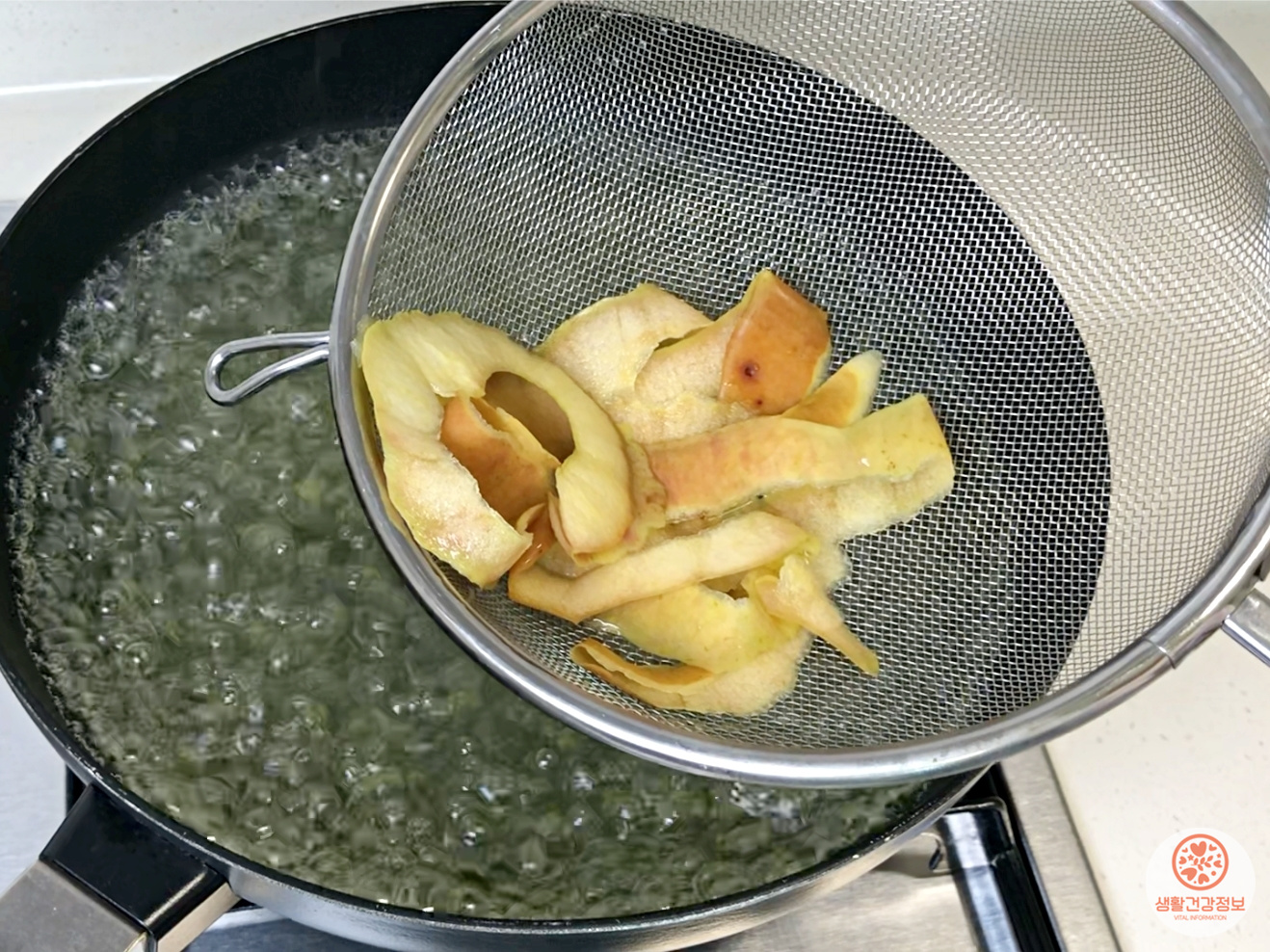물이 끓으면 사과껍질을을 넣고 1-2분 더 끓여요.