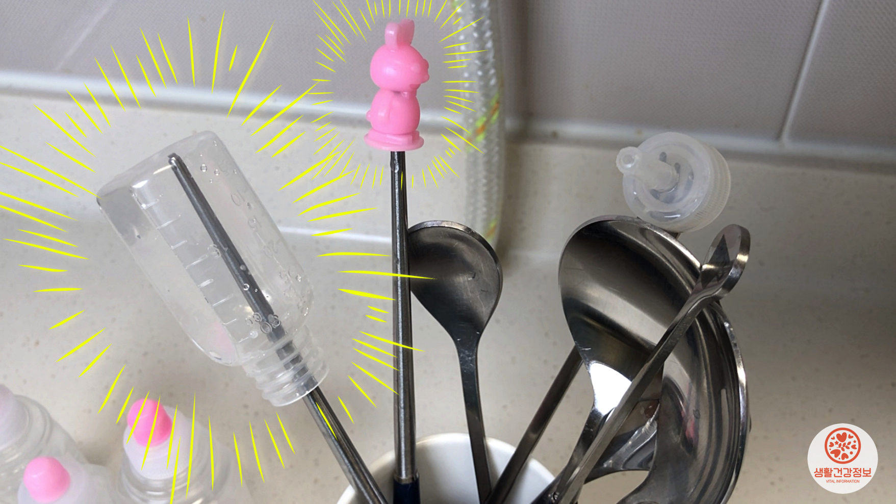 약통이나 뚜껑을 얇은 젓가락에 끼워놓으면
