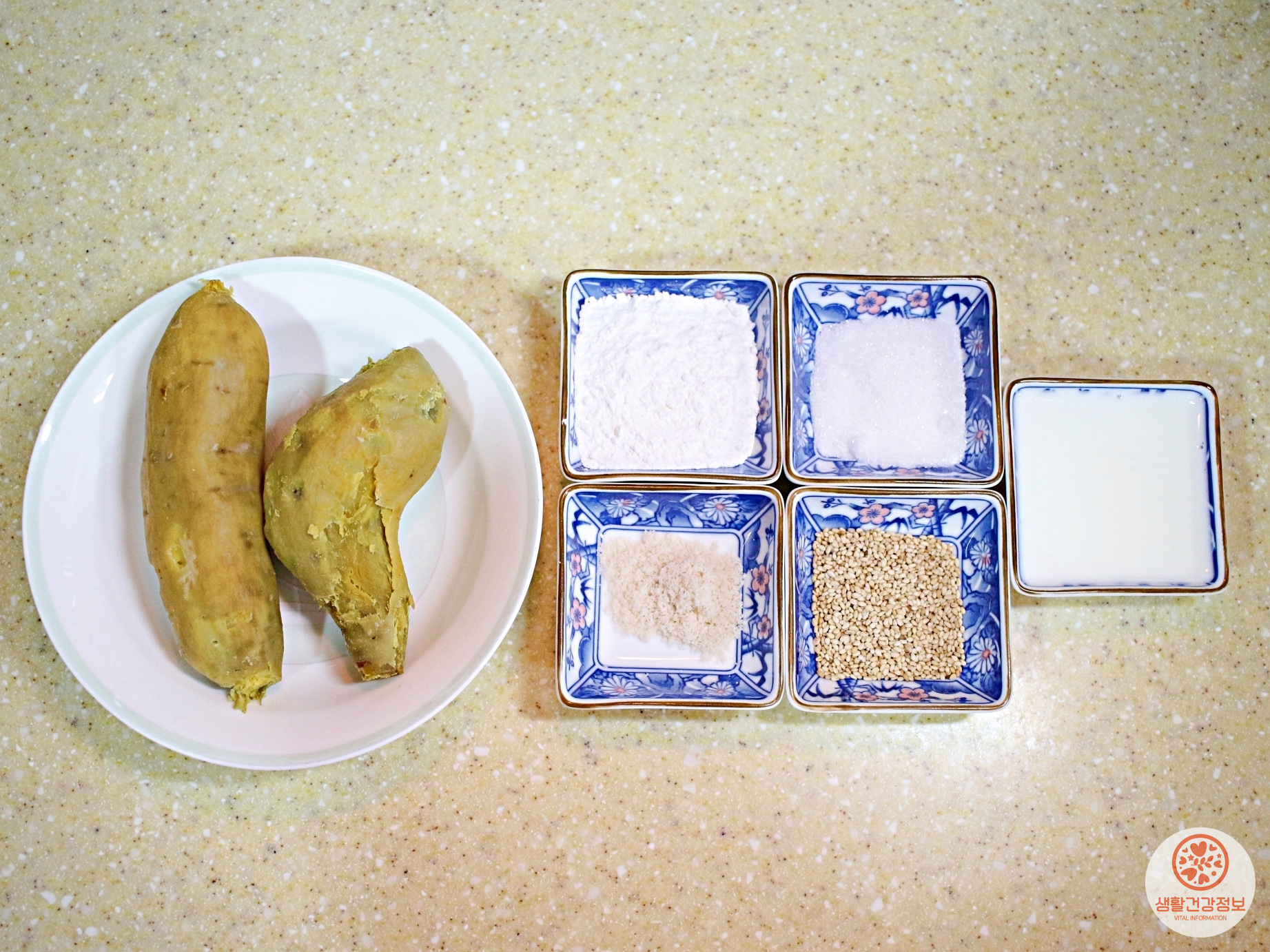 재료는 고구마, 찹쌀가루, 설탕, 소금, 통깨, 우유 준비했어요.