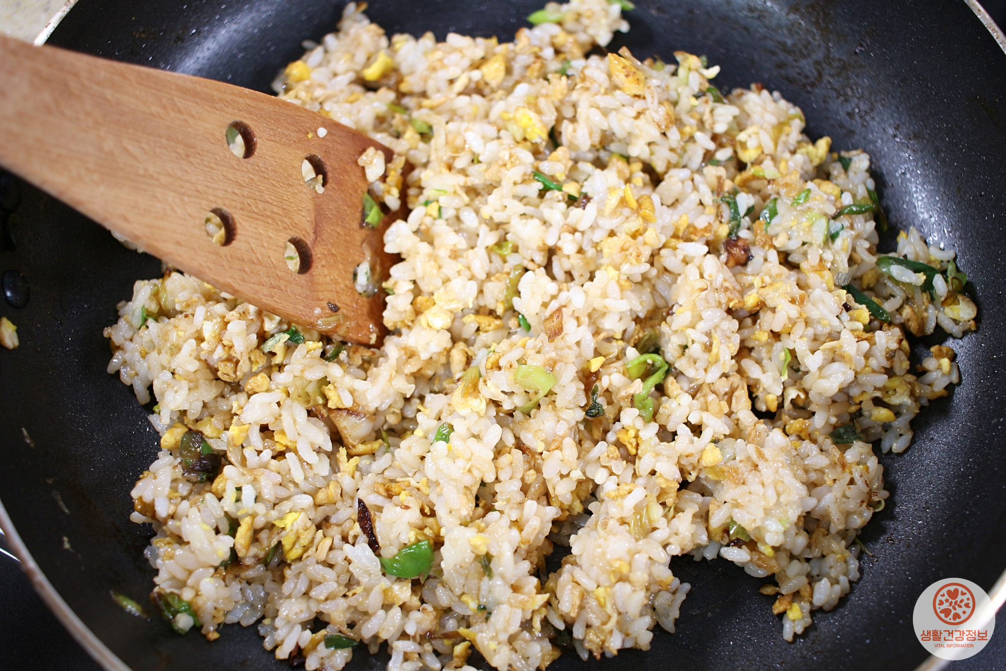 밥알을 살짝 눌러가면서 볶으면 양념도 더 잘 배고요.