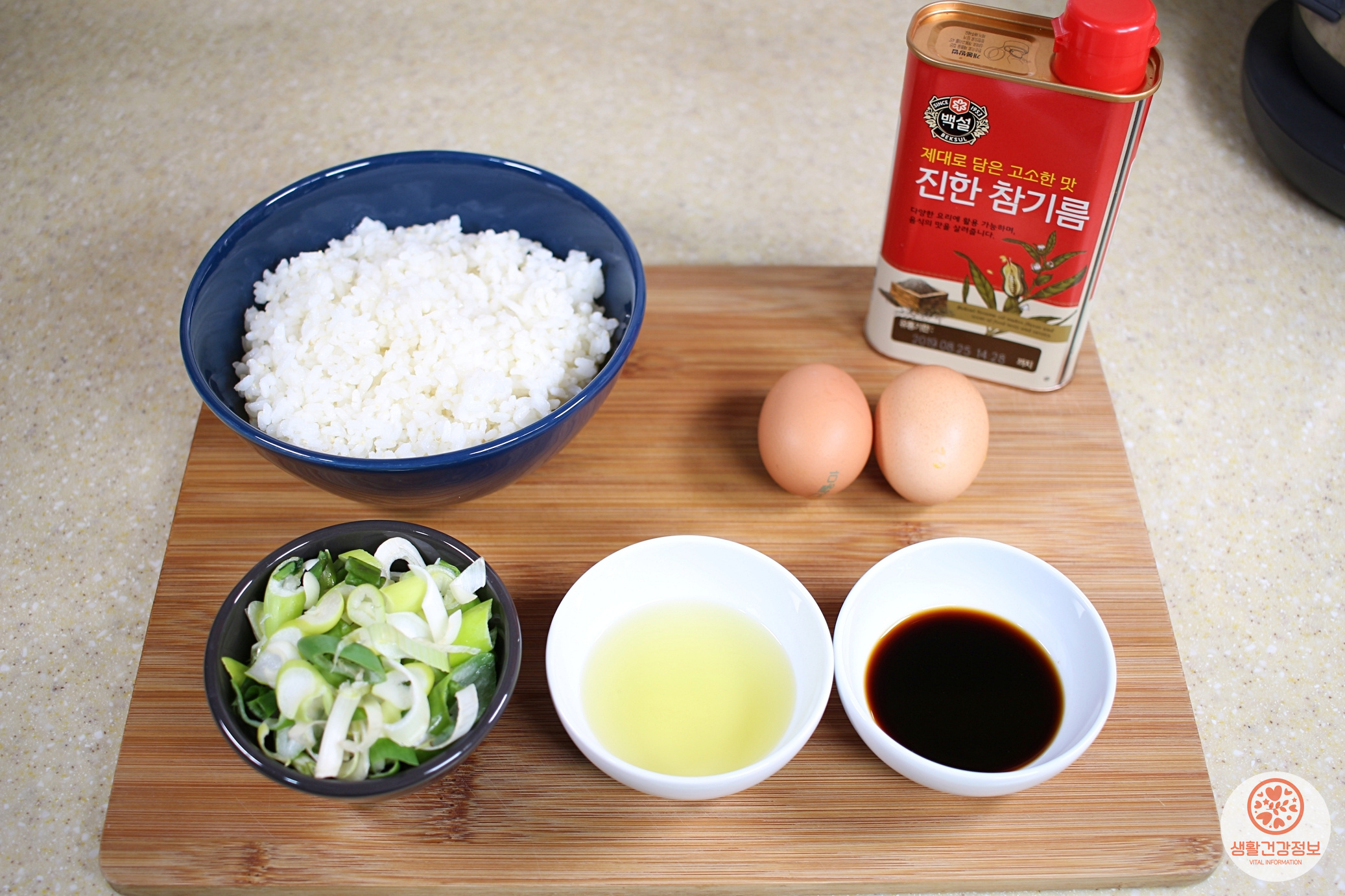 재료는 밥, 달걀, 간장, 대파, 식용유.