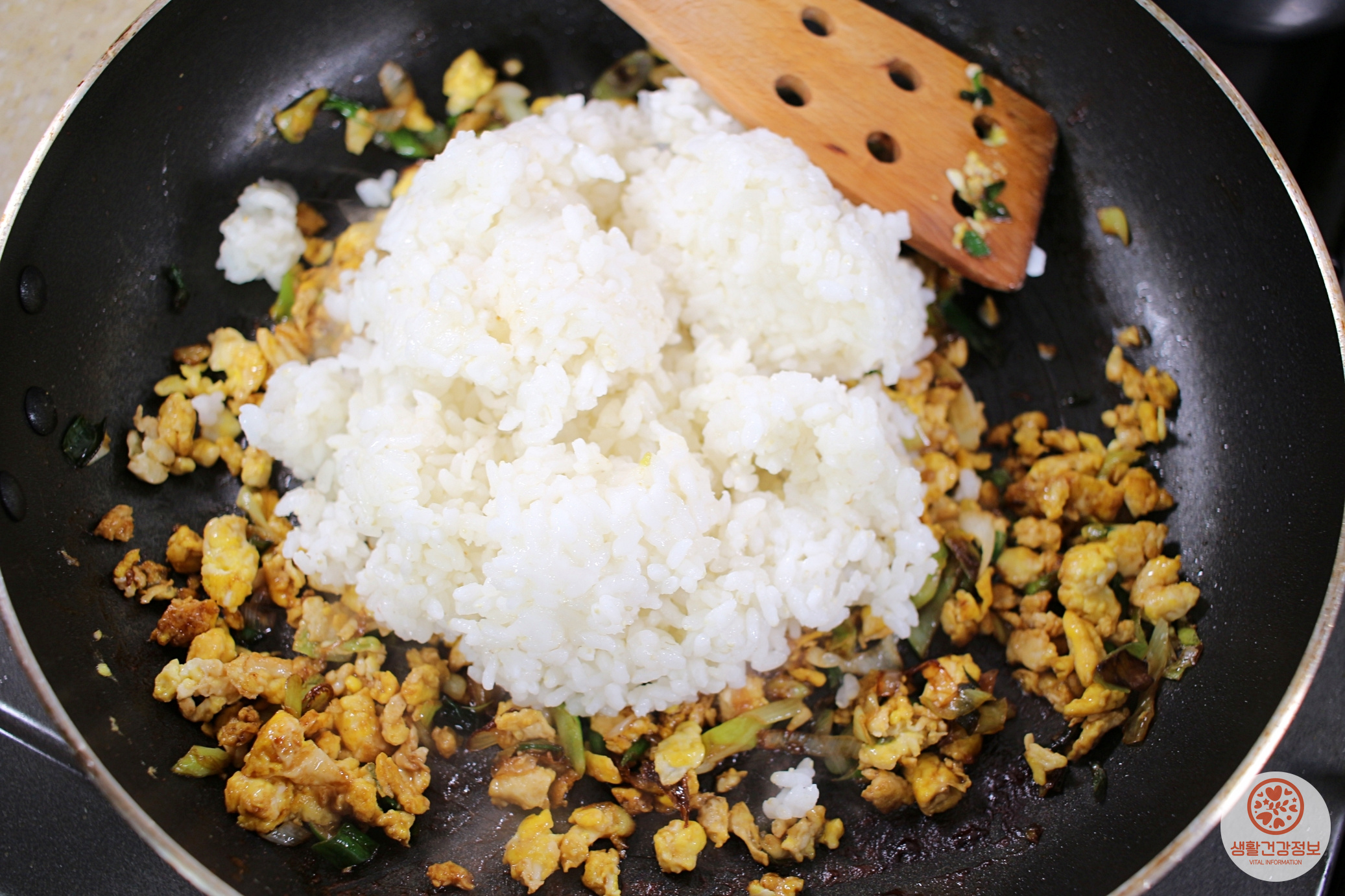 밥알을 살짝 눌러가면서 볶으면 양념도 더 잘 배고요.